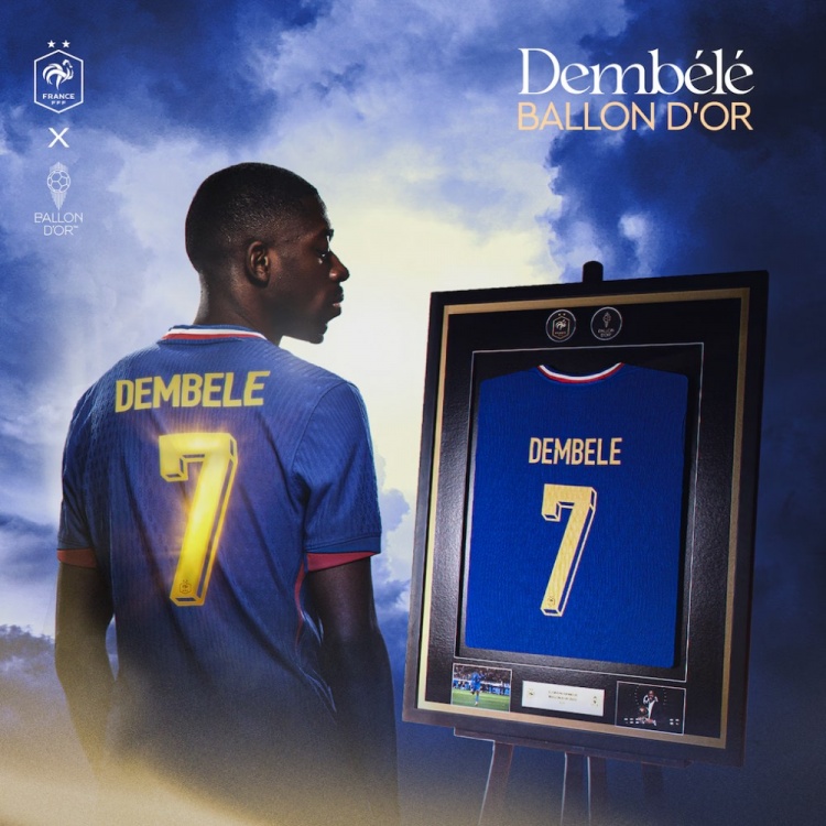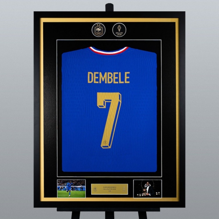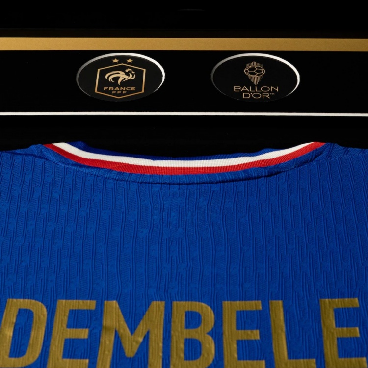 直播吧12月20日讯据法国足协官方在线商店显示,为庆祝登贝莱荣获2025年金球奖,官方推出了一款极其珍贵的联名收藏品,带有独家金色印字的登贝莱装裱球衣。