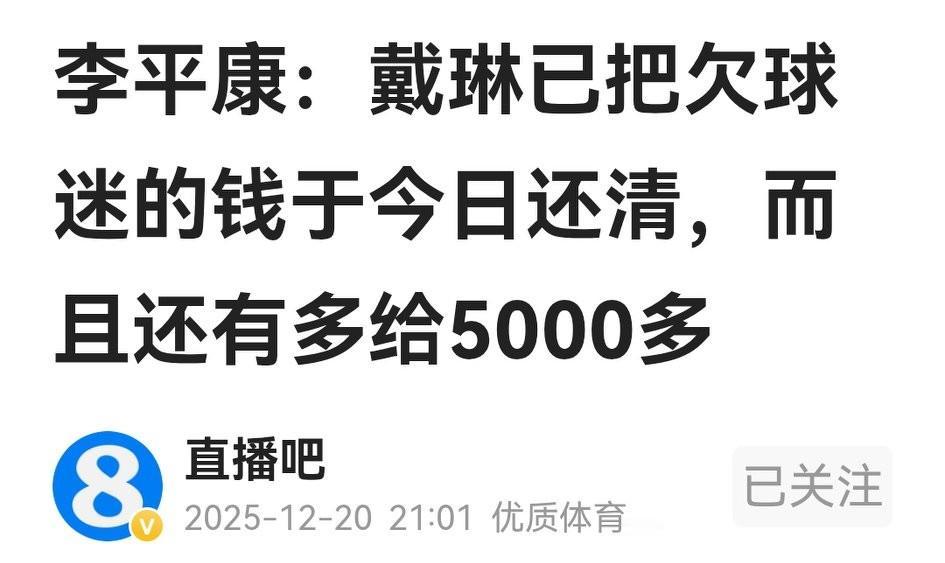 戴琳把欠球迷潘硕的钱还清,还多还5000元,说明老戴也非老赖,只是现金周转不灵。但愿离世的小潘在天有灵,知晓戴佬还钱的事情。 这事给球迷的深刻教训,不要和球员走得太近,一方面可能干扰球员训练和生活,助长其不良习气;另一方面又影响自己的生活甚至生存,即便给球员当铁粉,也别扯借钱的事情,以免伤身伤心伤感情。 戴琳多还钱,也许考虑了利息,也许为自己一丝安心,但无论如何也不能挽回名声。此事给球员的教训就是踢好球做好人,别去沾不能沾的东西,以免自毁前程。