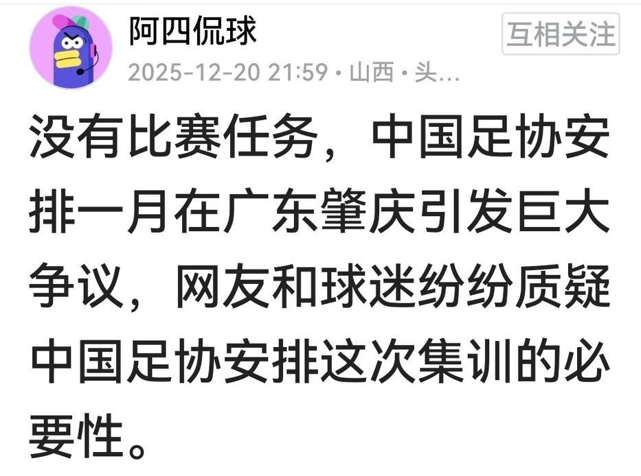 有球迷质疑下个月邵氏国足的集训,说在全年无战事情况下,新国足既要与u23比赛抢人,还要与俱乐部冬训争人。 但球迷都想到的事,足协当然知、中间商肯定懂,这里面名堂多得很。一方面,足协选邵佳一当主帅,总得让他做点事情;另一方面,球员一旦入选国足即身价大涨、可拿顶薪,在转会窗口关闭前组织新国足集训,主要就是这功能。 我要没猜错,邵氏一期的国足大名单之大,会让很多人吃惊!安东尼奥即便要留王钰栋、李昊等人打比赛,也会支持他们入选国足拿顶薪。
