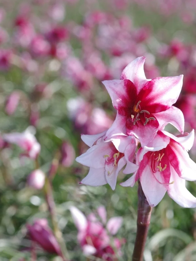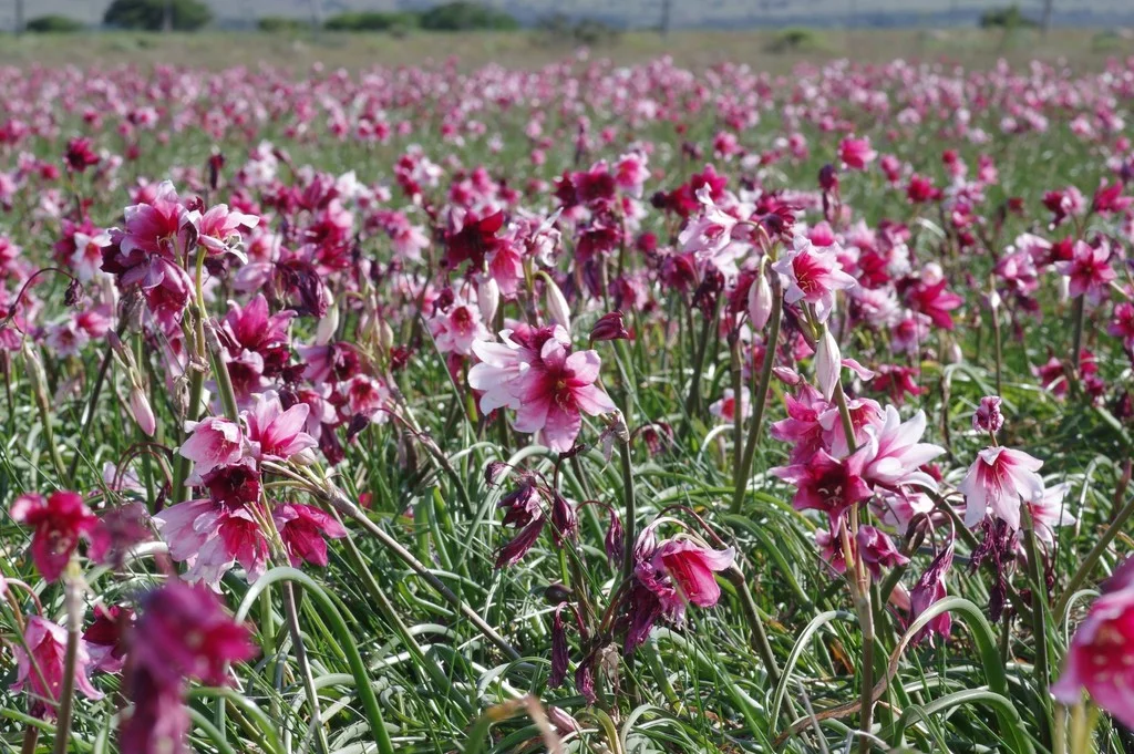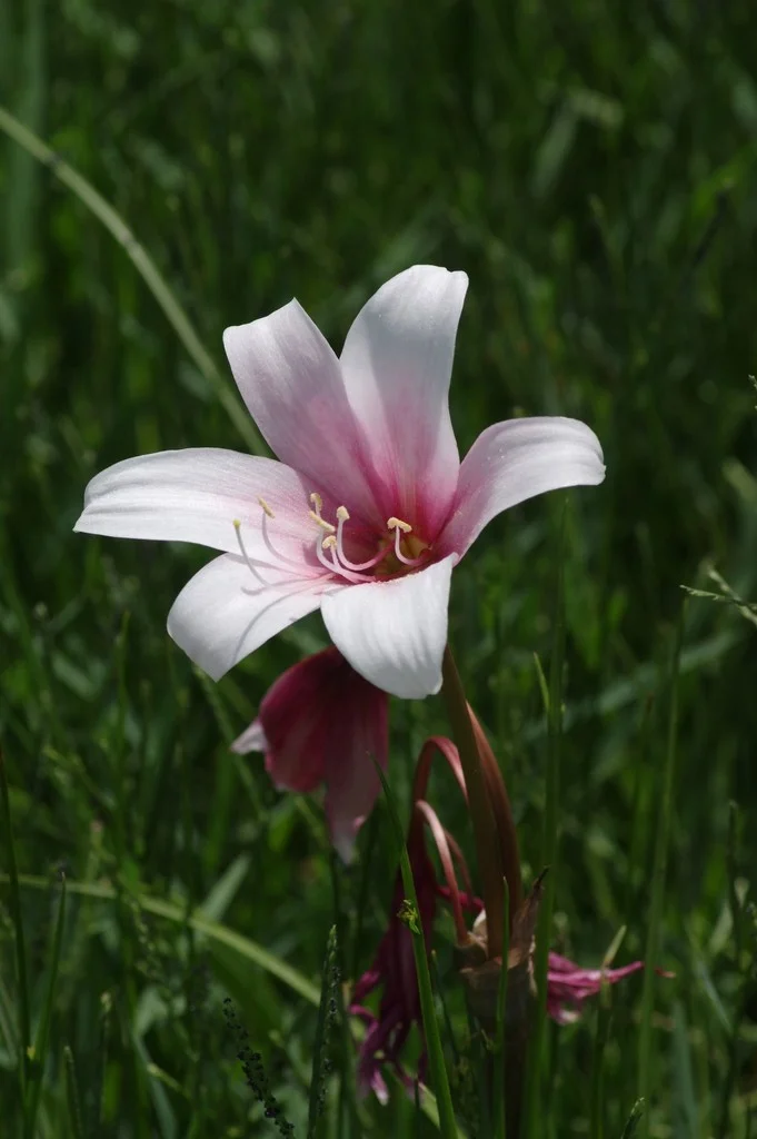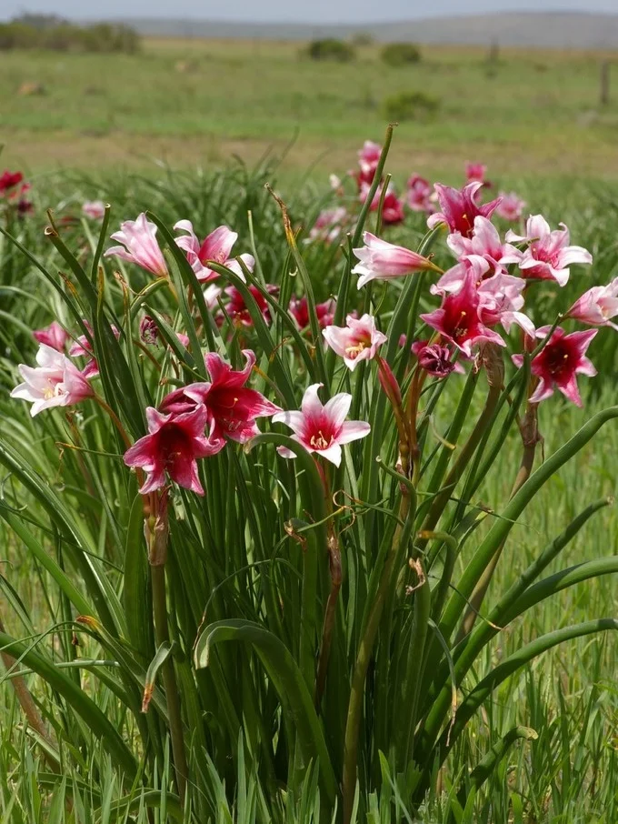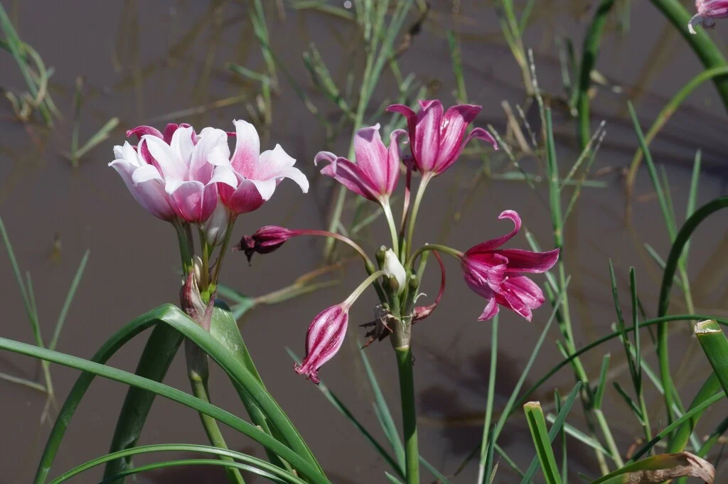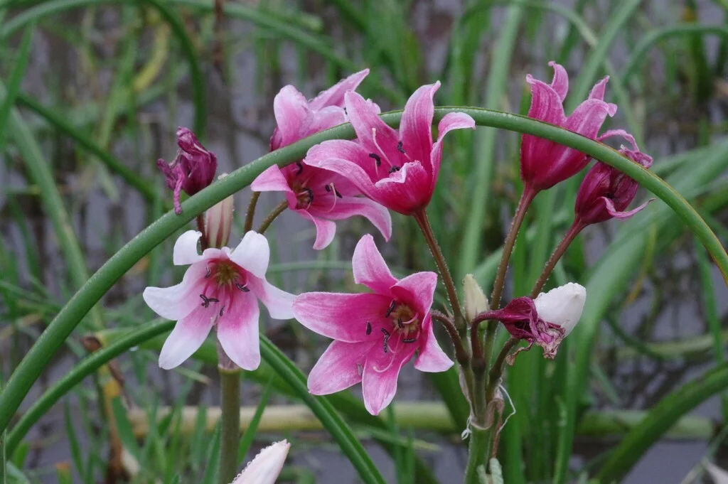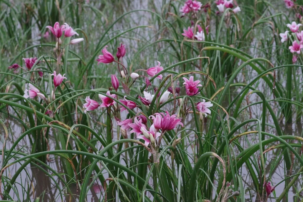 沼泽香殊兰的花朵呈顶生簇生,下垂,有细长的花筒,成熟时为白色或玫瑰粉色。