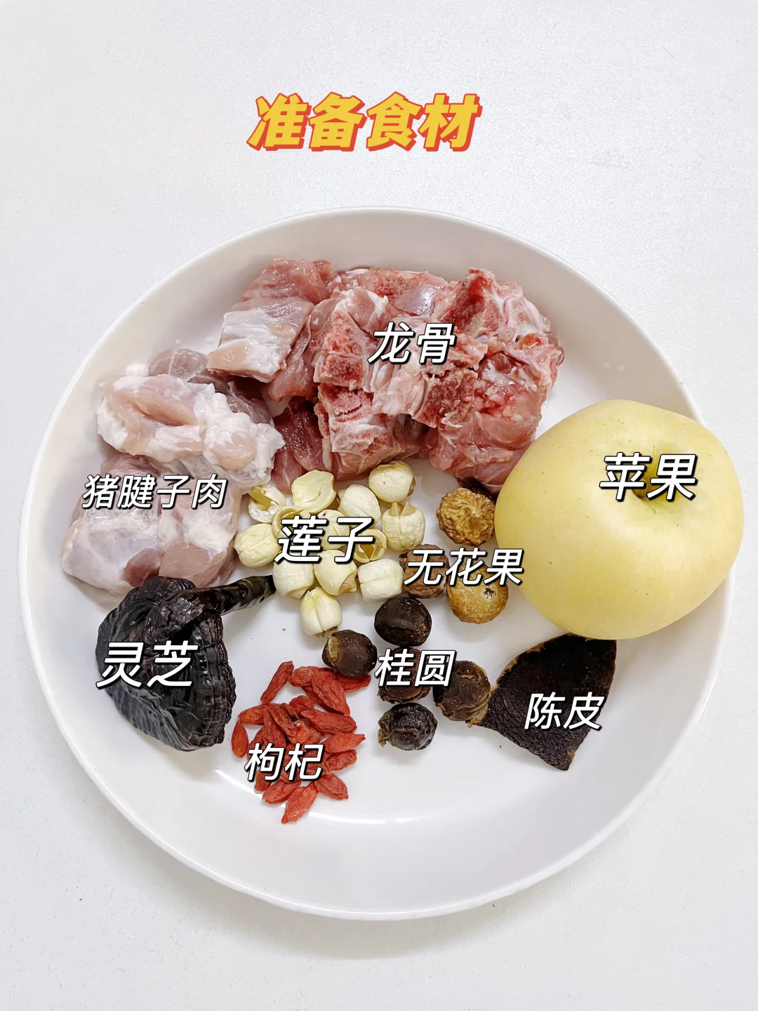 黄金苹果1个、灵芝片10g、龙骨300g、猪腱子肉150g、无花果4颗、桂圆8粒、陈皮1片、莲子20g、枸杞1小把