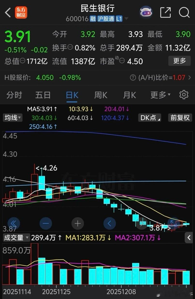 民生银行惨烈天天下跌本周二收盘价跌破3.90关口创近8个月新低,这是牛市以来跌的最惨的优质蓝筹股,本来涨的好好股价一度站上5.50元大关开启估值修复新周期,但是万万没想到7月11后开启快速下跌,天天被不明资金几万手几万手甚至几十万手砸盘打压,一路砸到10月13日3.87才企稳反弹,在4.05附近前后震荡了3个月也没有涨上去,最近又持续9连跌才企稳,本周探底回升止住下跌,不过也没有涨起来,很可能是受到2笔折价的大宗交易影响,从一些消息了解到股东东方集团质押的股票被强制拍卖了,按我理解这种换股东对民生银行本身经营并没有影响,下周市场应该会恢复理性,每股净资产12.83股价不到4元长期价值投资者千万不要割肉了。