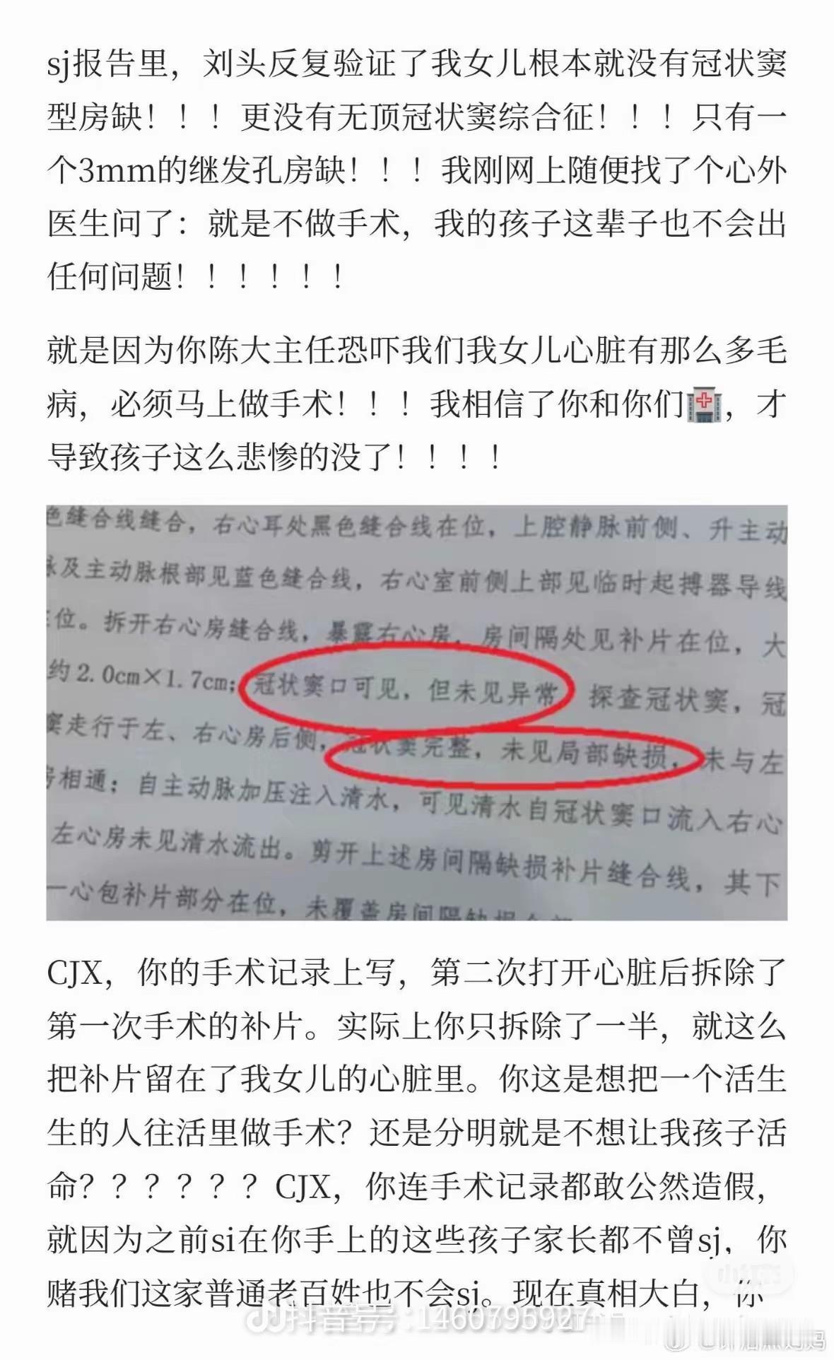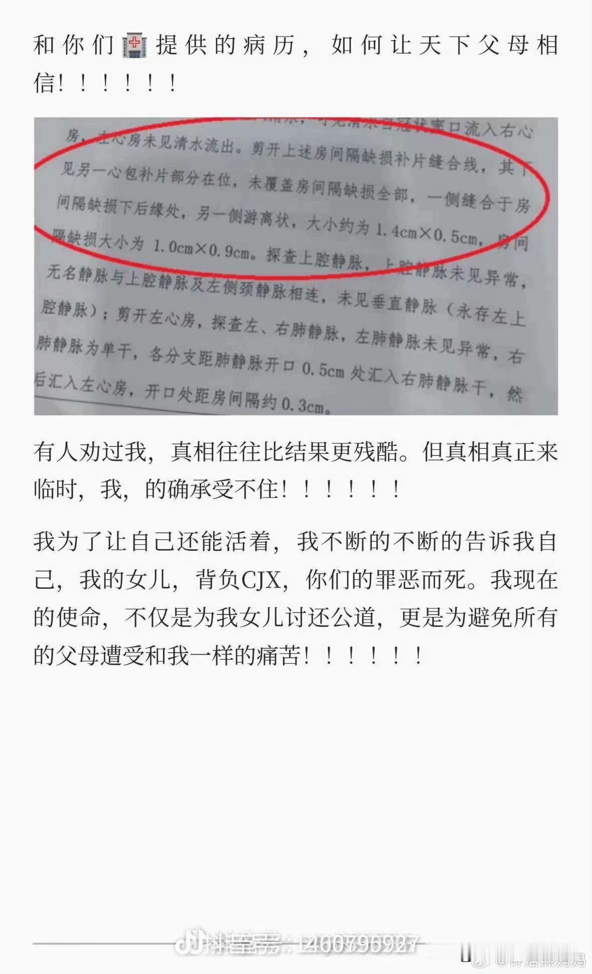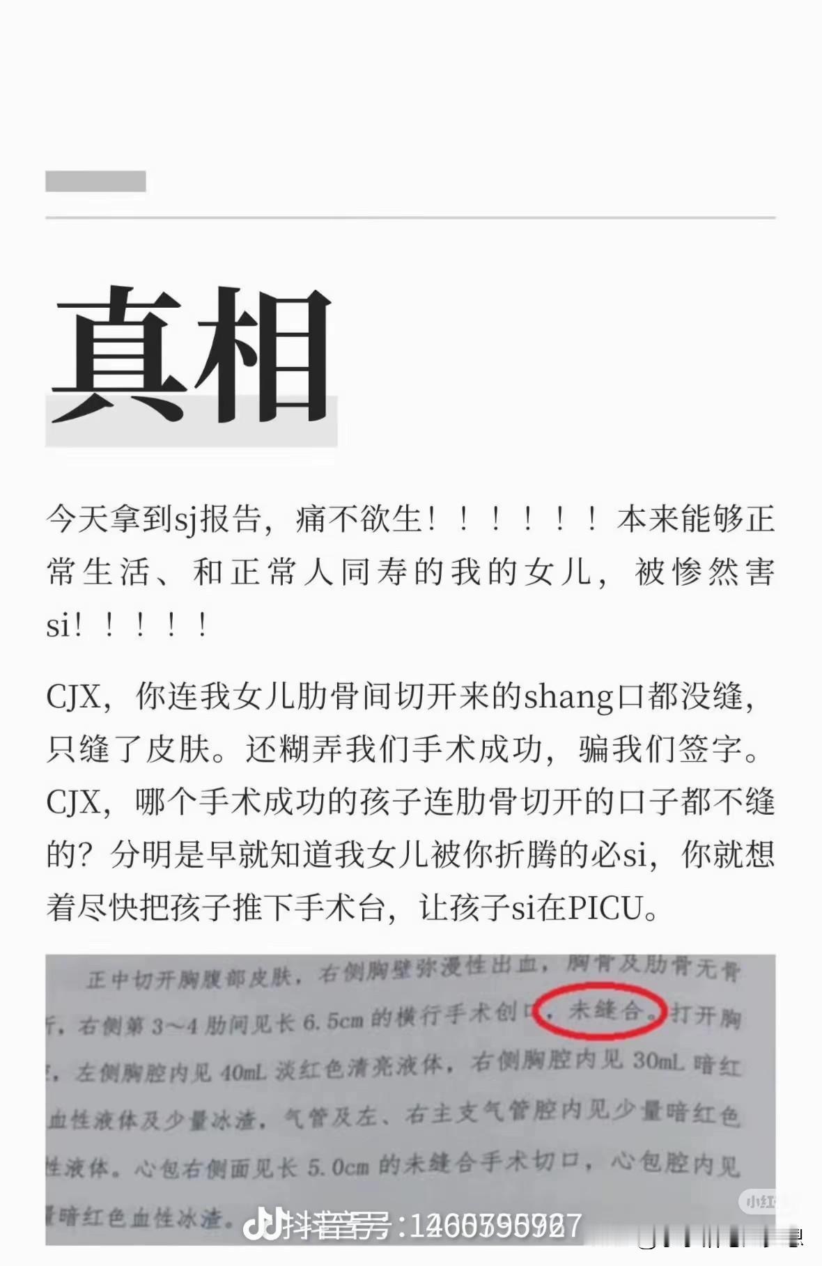 小洛熙:“爷爷,我是健康的!”刘良法医:“爷爷知道!”尸检结果出来,根本就没有病,彩超是假的,一开始说的七厘米的房缺,其实只有不到三毫米还是可以自己愈合的那种,根本就不用做手术,真正死亡的原因是血流干而死的。 从手术室推出来的时候,孩子已经死了, 开了缝,缝了开,最后都懒得缝了,临走前最后一面也没见到,饿十几小时一口奶也没喝到,饿着肚子走的,还光溜溜一个人躺了一晚上,可这些王八蛋还告诉家属说手术成功,要转到ICU,其实是给装的起搏器打的肾上腺素,才让孩子看起来有生命体征,拖到晚上那里面的东西消耗完了,才通知家属说孩子不行了,但僵硬了都不给看,是络熙妈妈跪着求来的,还要妈妈保持情绪稳定,才答应给看的。 血流干了,孩子身体都僵硬了,半身血紫色,把身上贴的纱布揭开,刀口都没缝,里面更是残破不堪,已经硬了缝不上了,就这么扯咧着。。。 这个孩子做尸检的时候,一次次冷冻解冻,冷冻解冻,整个身体都被切开了,据说头也被切开了,家长还一次次的去看,最后又是这个结果,我一个旁观者,看了都老是忍不住掉眼泪,我们为什么这么触动!因为她本无重病,非必要手术,医生却用不可避免的损伤来诱导家长强加这台手术,没有这台手术,她本应该活的好好的。 外人看了都难受,孩子妈妈,家属怎么受得了呀,肚子上的妊娠纹还在,松垮的肚皮也在,所有的痕迹都在提醒她来过,可是却没有留住她,孩子没了!看了洛熙妈妈今天的视频,真的心如刀割,她这一生该怎么释怀啊!