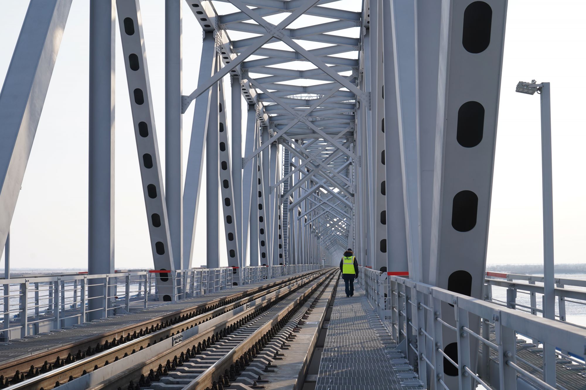12月6日,在俄罗斯犹太自治州下列宁斯阔耶,俄方人员在跨越阿穆尔河(黑龙江)的同江-下列宁斯阔耶铁路大桥上巡视。新华社记者刘恺摄