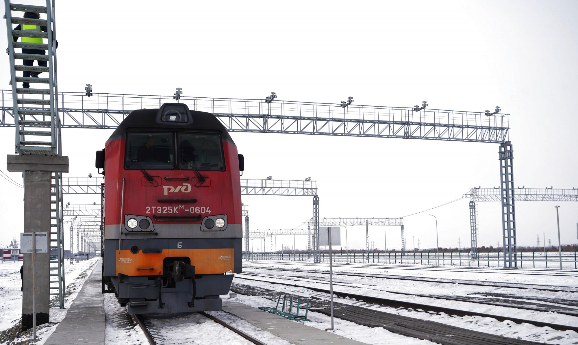 12月6日,一辆即将开往中国的俄罗斯货运列车停靠在俄罗斯下列宁斯阔耶铁路口岸。新华社记者刘恺摄