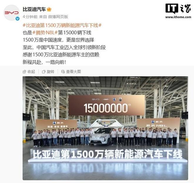 据IT之家此前报道,比亚迪官方在12月18日宣布,比亚迪第1500万辆新能源汽车下线,也是腾势N8L第15000辆下线。比亚迪今年前11月累计销量达418万辆,同比增长11.3%。其中,海洋网今年前11月累计销量达203万辆,同比增长17.9%。