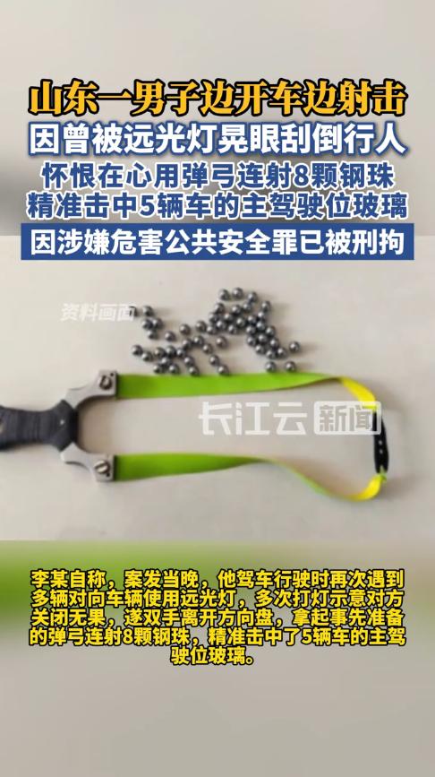 “必须严惩!”12月12日,山东临沂,一男子开车行驶在国道上时,对向的车突然频繁闪大灯,随后就听到“砰”的一声闷响,自己的车玻璃碎了!男子立即靠边停下车,发现还有好几辆车的玻璃也碎了。网友:是不是没关远光? 开车外出时,安全始终要放在首位,当行驶在光线不好的路段时,司机应该开启远光灯,但如果对面有车辆或者行人,一定要及时切换成近光灯,不然很容易给对方造成影响,从而引发事故。 李先生对于这种事就很有发言权,之前他开车外出时,就因为对向的车一直开着远光灯,导致他看不清前方的路况,最终蹭到了一旁的行人,因此赔偿了医药费。 也正是这次事故之后,李先生就对那些开远光的司机格外厌恶,遇到之后就通过闪灯的方式开提醒对方,可是有的人依旧不关灯,这令他十分恼火。 为了给这种人一个教训,李先生购买了一个弹弓,只要是提醒后还不关远光的,他就用弹弓射人家! 这天晚上,李先生行驶在国道上,迎面而来的好几辆车都开着远光灯,提醒无果后,他便降下车窗,向着几辆车发射钢珠,随后迅速逃离。 警方接到报警后,立即展开调查,最终将李先生逮捕归案,目前已被依法拘留。 虽然说这种开远光的人很可恶,但咱们也要采取理智的方式劝阻,不能因此破坏人家的财物,这样就属于违法行为了! 信息来源:《对夜间开远光灯怀恨在心 男子驾车中松开方向盘 发射8颗钢珠击中5辆车被刑拘》广州日报