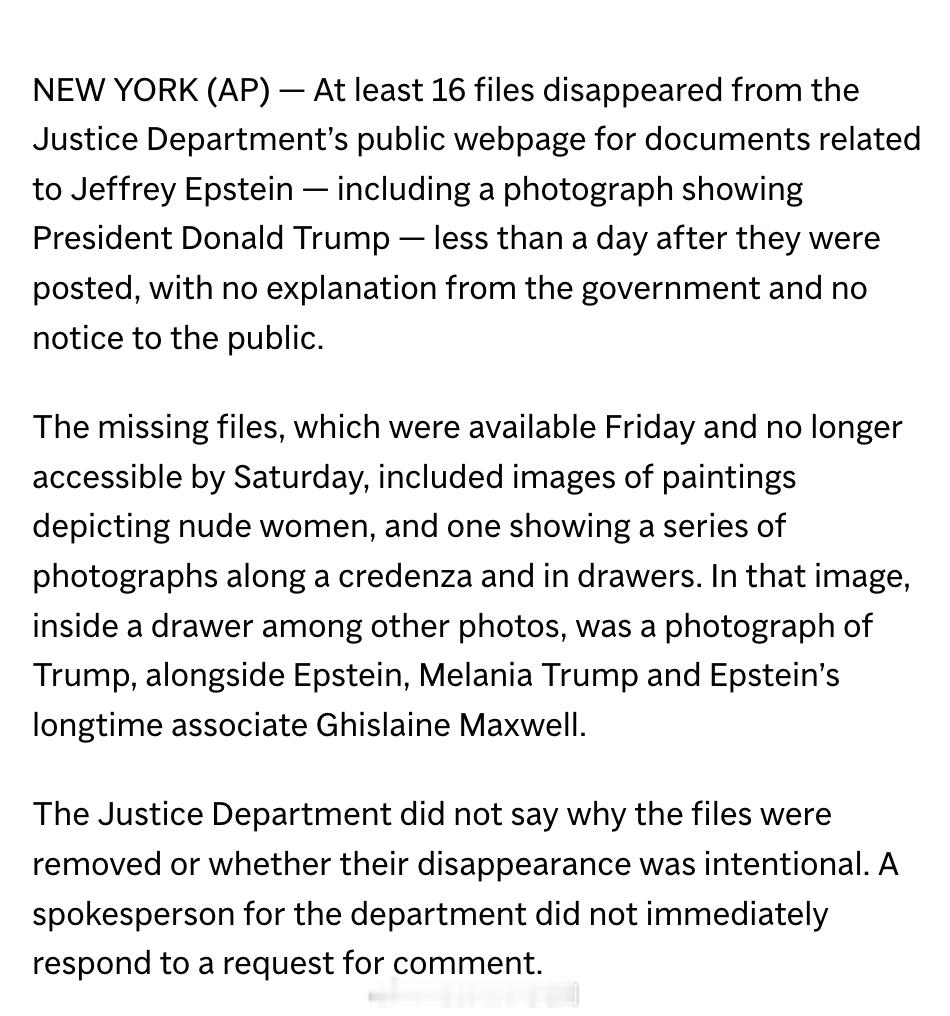 司法部昨天公布在网上的爱泼斯坦文件中,有至少16份文件在发布不到一天后悄然消失,其中还包括一张出现了川普照片的照片。政府到目前既没有给出任何解释,也没有向公众发布下架通知。比如这张编号EFTA00000468的照片,之前的链接是:justice.gov/epstein/files/DataSet%201/EFTA00000468.pdf目前无法访问。今日焦点爱泼斯坦文件热点现场海外新鲜事