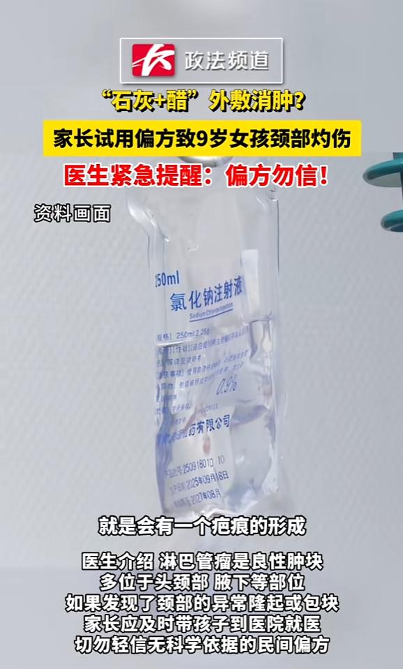 一女孩因脖子肿块,家长轻信土法偏方,结果二次受伤进了医院!湖南长沙某医院急诊室,最近收治了一位脖子起泡的小女孩。医生一问才知道,原来她家长听信“民间偏方”,用石灰和醋搅拌敷在孩子脖子上,想给肿块消肿。没想到,偏方没治好病,反倒把孩子的皮肤给烫伤了,还差点落下疤痕。 偏方这玩意儿,听起来神乎其神,实际操作起来,往往比魔法还魔幻。家长一腔热情,最后换来的却是孩子的痛苦。人情可贵,科学更不能丢。 故事的起点,其实是一份家长的焦虑。小女孩脖子反复长包,家里大人看着心疼,四处打听“土办法”。 有天,有人传来个“土方子”:石灰加醋,搅一搅,敷上去准消肿。家长一听,觉得简单直接,就动手调了糊糊,敷在了女儿脖子上。 没想到,这一敷非但没见好,反而出大事。孩子洗澡时,热水一冲,立马红肿起泡,疼得直哭。家长手忙脚乱带去医院,医生一看,直摇头。 “救命偏方”成了“催命毒药”,小病变大病,这种“民间智慧”真让人服气。 世上最怕的不是不会治病,而是只信偏方不信科学。 其实每个家长都怕孩子生病,想快点好是人之常情。但如今是信息爆炸时代,江湖传说、短视频、微信群……各种“神方子”层出不穷。 可家长们一定要冷静——治病不是“拼手气”,更不是“谁说得多听谁的”。靠谱的医生、正规的医院,才是孩子健康的保障。别让一时的侥幸,换来一辈子的遗憾。 偏方流行的背后,是对医疗体系的不信任,也是知识匮乏下的盲从。该醒醒了,家长的爱心不能变成孩子的二次伤害。 急诊室里,女孩的脖子已经开始脱皮,医生赶紧处理创面,还得叮嘱家长:“以后遇到问题,别乱用偏方,来医院才有谱。” 家长红着眼眶,嘴里喃喃道歉,女孩小声抽泣,整个场面说不出的尴尬和心酸。 医生后来才发现,孩子的肿块其实是良性,手术切除就能痊愈。如果一开始就正规治疗,根本用不着受这份罪。 家长悔得直拍大腿,连连说“以后再也不信偏方了”。 有些错误可以弥补,有些后果却是“一步错、步步错”。医生能治病,却治不了偏方带来的“无知之伤”。 有网友留言:“小时候我妈拿牙膏治烫伤,结果越抹越严重。” 还有人说,“我邻居信‘葱白插鼻’,最后鼻腔感染进医院。” 更有人感慨:“现在网上的‘神方’太多,家长还是要学点常识,别只会转发不懂分辨。” 偏方误事的新闻年年有,真正吸取教训的却没几个。到底啥时候大家才能明白,科学不是白来的。 说实在的,家长信偏方,说到底还是“怕花钱、怕耽误、怕正规治疗不灵”。加上现在自媒体、短视频动不动就推“祖传秘方”,有些人一看“点赞十万”,就真信了。 其实医学的进步,是一代代科学家用实验证明出来的。偏方再神,也敌不过科学的严谨。 我身边不少人遇事就想“试试土办法”,结果往往小病拖成大病。 有时候,家长的焦虑,是对未知的恐惧,也是对信息的盲信。孩子的健康,靠的是科学和理性。 有病就医,别自己琢磨。家长们请记住:你不是医生,互联网也不是医院。健康无小事,切莫乱试药。 不是每个家长都懂化学反应,但每个人都该懂点基本常识。与其相信偏方,不如多读几本靠谱的健康书。 你有没有遇到过家里人“偏方治病”翻车的事?你怎么看待现在社会对偏方的盲信?科学和家长的关爱,怎样才能“双保险”? 【麻烦您点击“关注”,多多点赞、评论、收藏,成为我的铁粉,致力于每天把知识和快乐带给您[玫瑰]】