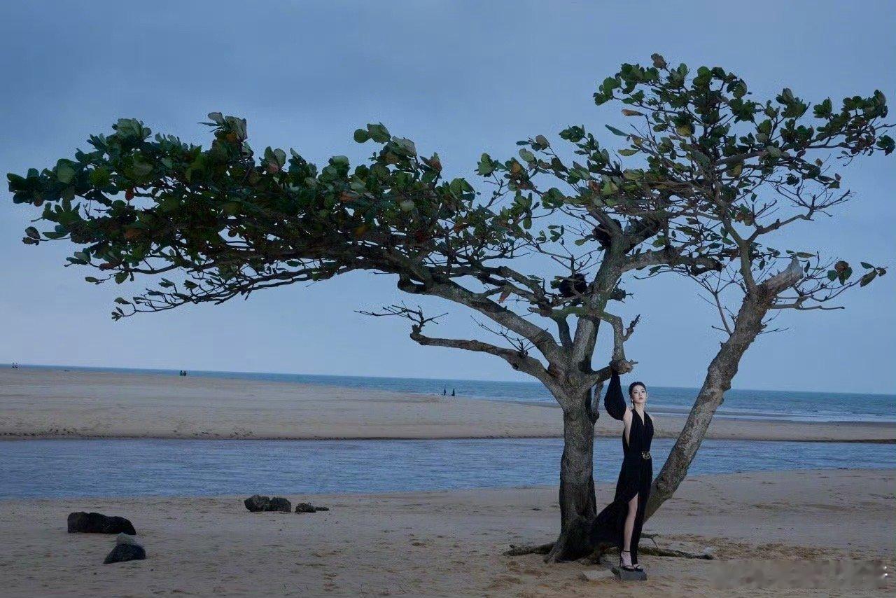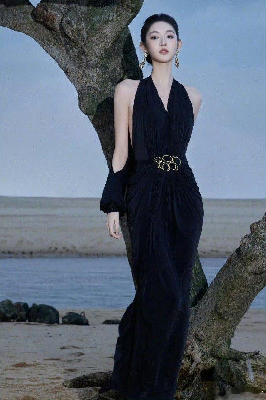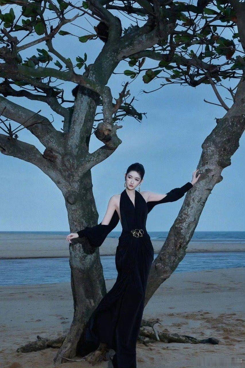 王玉雯暗夜黑天鹅 王玉雯这身黑天鹅造型,简直是写进时尚教科书的一笔。丝绒长裙与金属腰封的碰撞,海风与暗夜的交织,她往那一站,便是欲望与克制、故事与留白的完美平衡。这种美,是能穿透镜头的视觉诗。