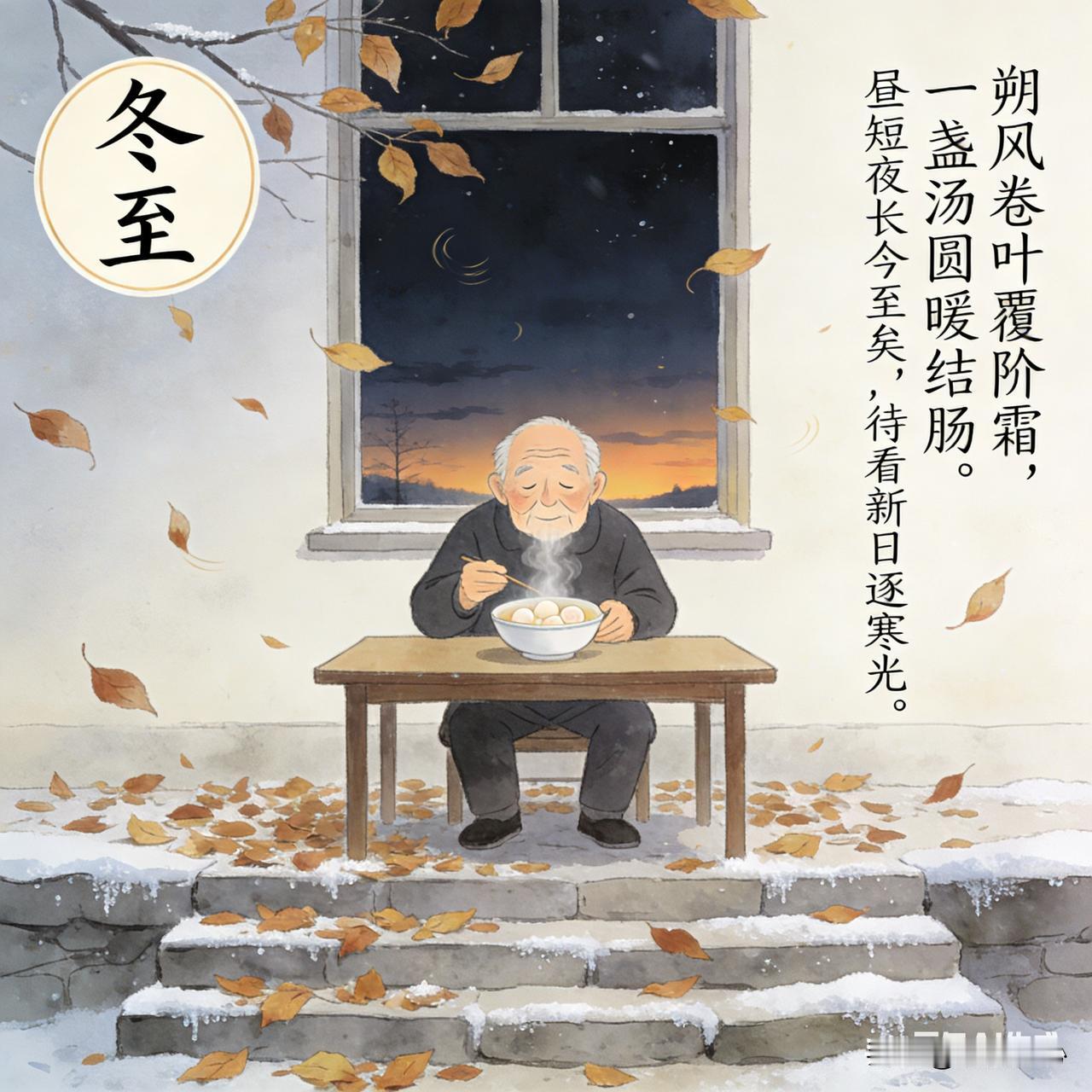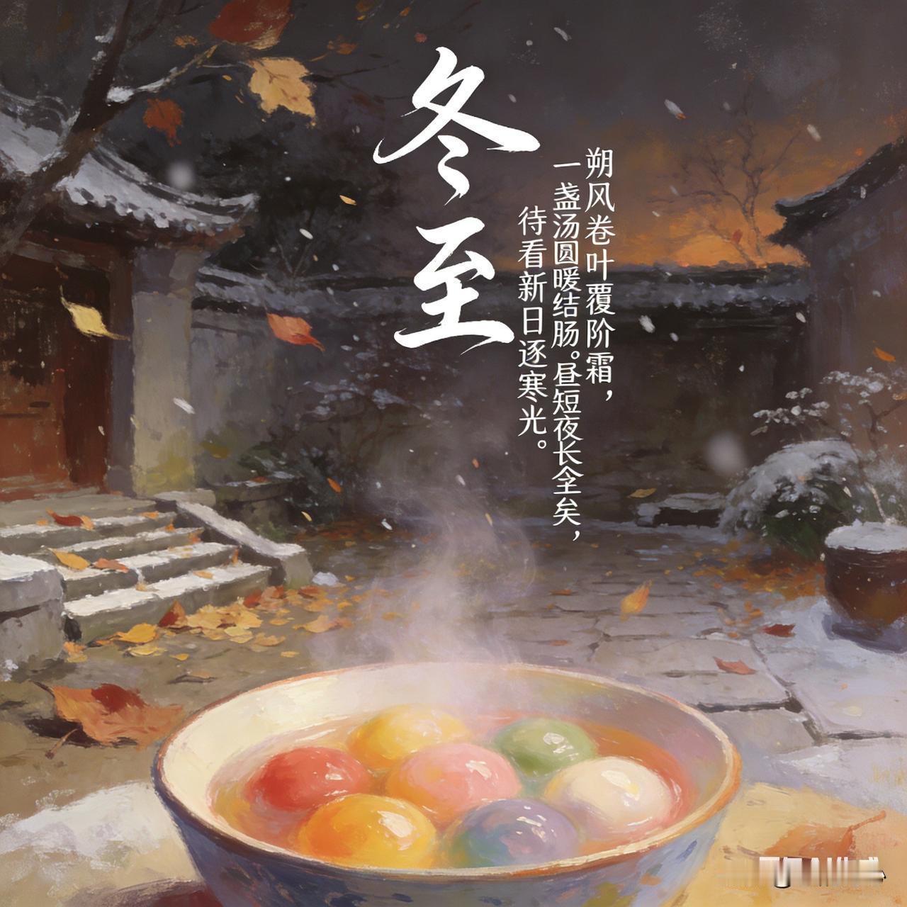 《冬至》乐韵诗心原创诗词: 朔风卷叶覆阶霜, 一盏汤圆暖结肠。 昼短夜长今至矣, 待看新日逐寒光。 这首《冬至》写得太妙了!“朔风卷叶覆阶霜”,一下子就把冬至朔风凛冽、落叶覆霜的景象展现在眼前,画面感超强。 冬至这一天,昼短夜长,“一盏汤圆暖结肠”,汤圆下肚,温暖直达肠胃,也暖了人心。古人说“冬至大如年”,这一天大家围坐一起吃汤圆饺子,满是团圆的期许。 “待看新月逐寒光”,又带着一种对未来的期许。冬至过后,白昼渐长,就像新月逐光,希望在寒冷的日子后,温暖和美好会如期而至。