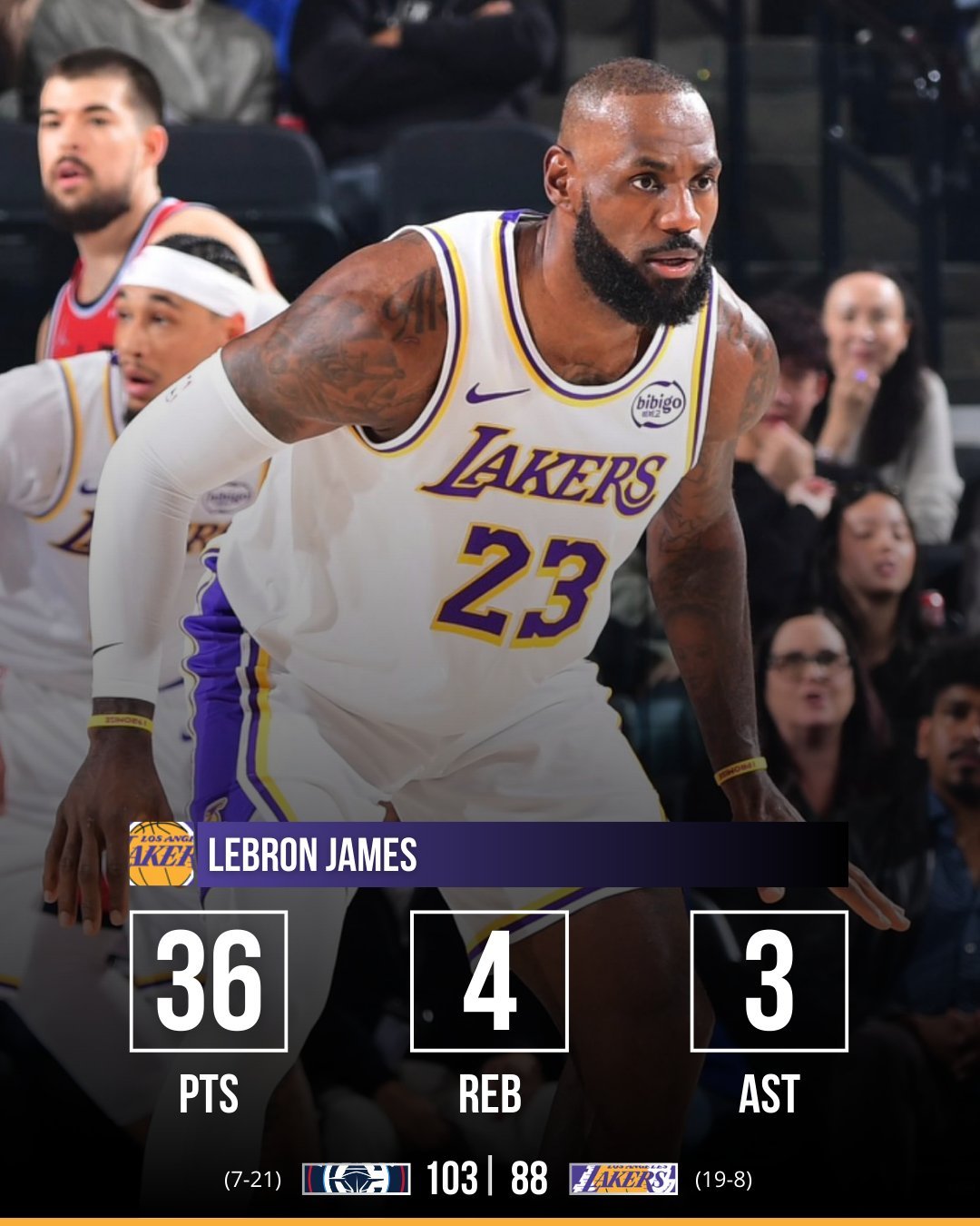 什么水平?!今天的詹姆斯:——投篮28中15,三分7中3,罚球5中3——拿下36分4板3助2断,本赛季首次30+——40岁356天,NBA历史最老30+球员——湖人88-103不敌快船里夫斯、艾顿、八村缺席,东契奇伤退,全场最高36分,这场的詹姆斯应该没得黑了吧??湖人vs快船洛城德比快船战胜湖人