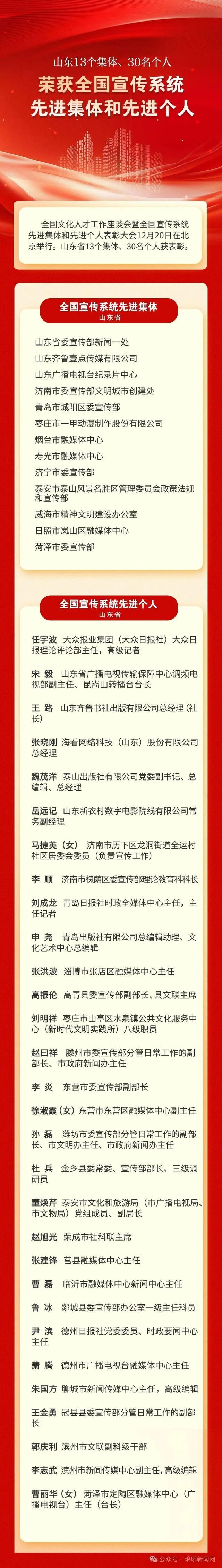 山东省13个集体、30名个人获表彰