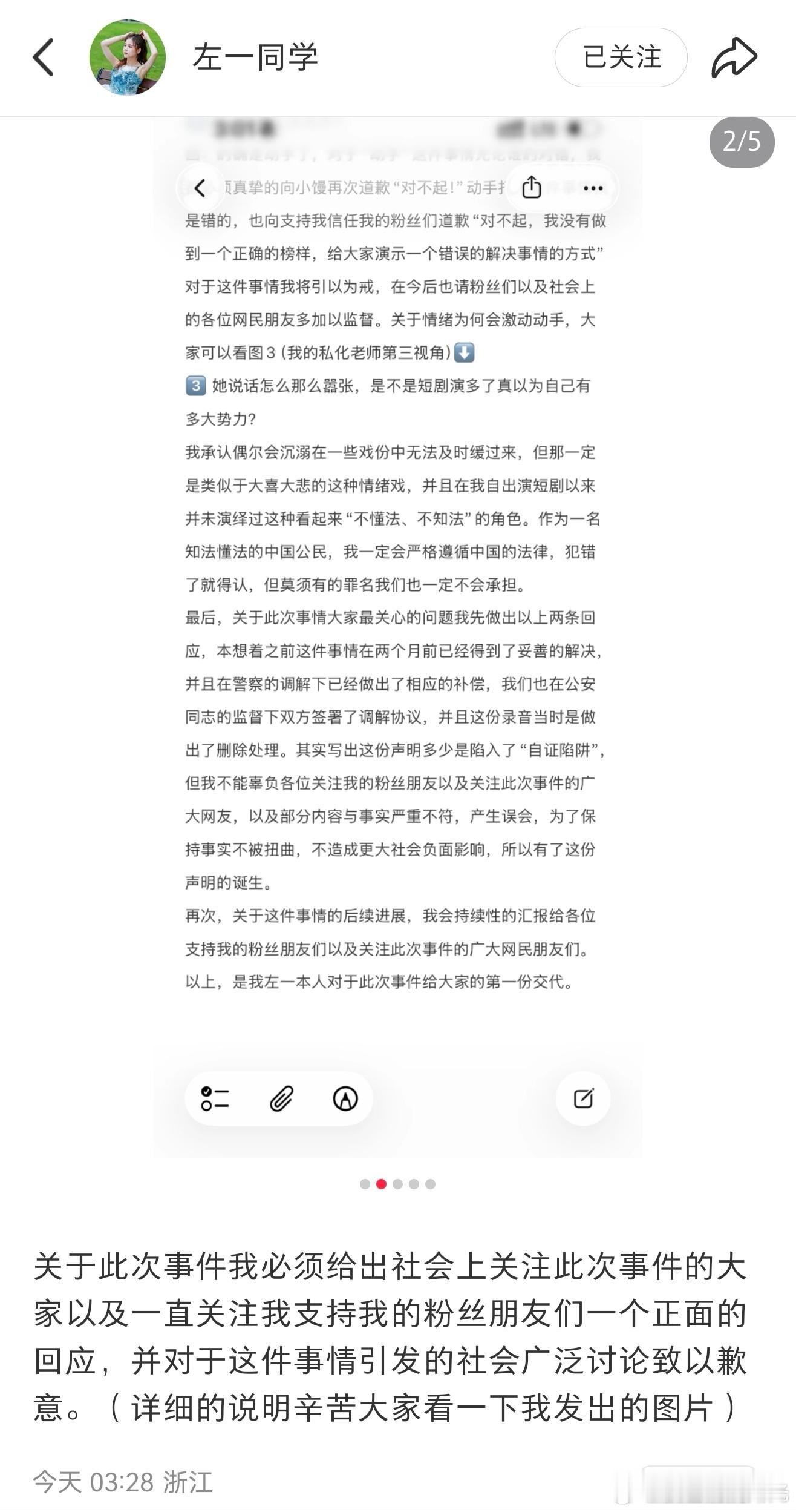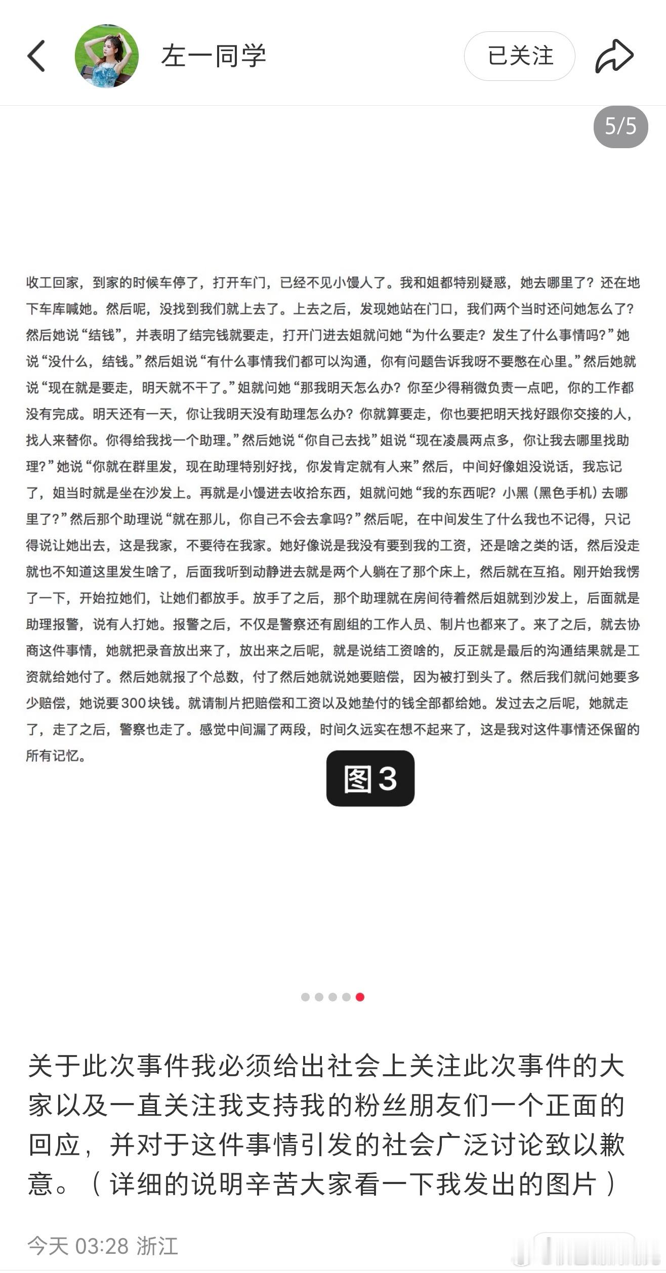 左一道歉左一为打助理道歉 左一发文承认打助理小小馒,并为此事道歉。