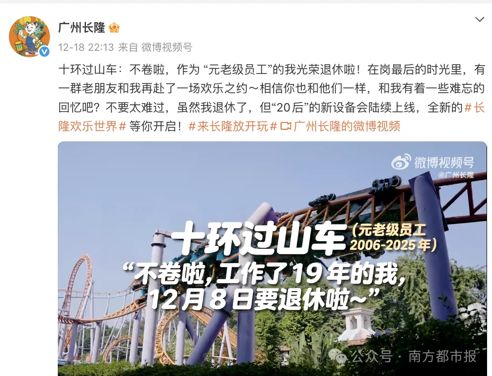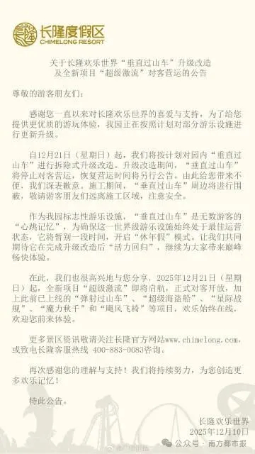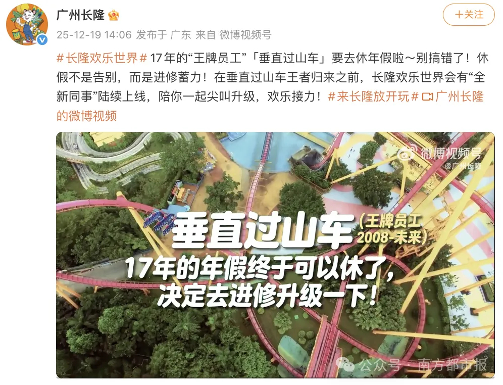 #长隆垂直过山车休年假去了#【陪伴了大家17年的“王牌员工”要“休假进修”了!🎢】#长隆垂直过山车是懂超长待机的#欢乐世界宣布,标志性项目“垂直过山车”将于今日(12月21日)起正式暂停营运,进行拆除式升级改造。这个被誉为“世界过山车之王”的明星项目,自2008年运营以来,以其60米垂直落差、时速112公里的极致体验,成为了无数人的青春记忆。园方表示,这次不是告别,而是为了明年(2026年)的“王者归来”蓄力升级。在此期间,长隆欢乐世界将有“全新同事”陆续上线,接力欢乐。你坐过这台垂直过山车吗?快来评论区分享你的尖叫记忆!👇