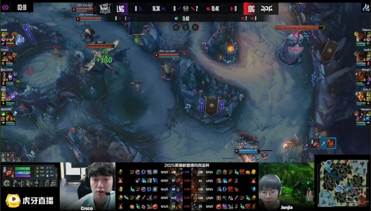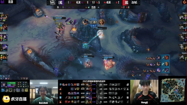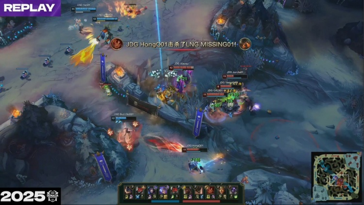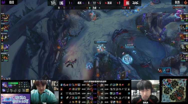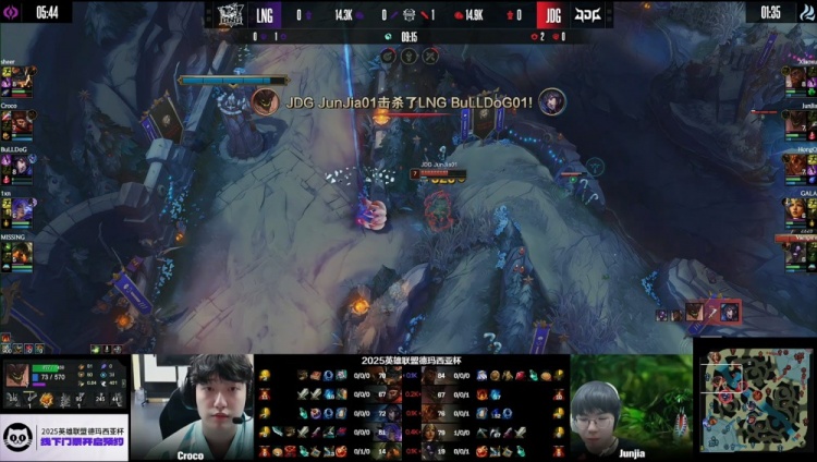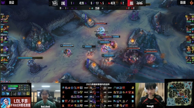 [23:09]中路团战,Junjia石头人离谱闪现空大,sheer兰博完美大招火烤三杀,LNG打出0换5团灭JDG,回头拿到小龙听牌火龙魂。