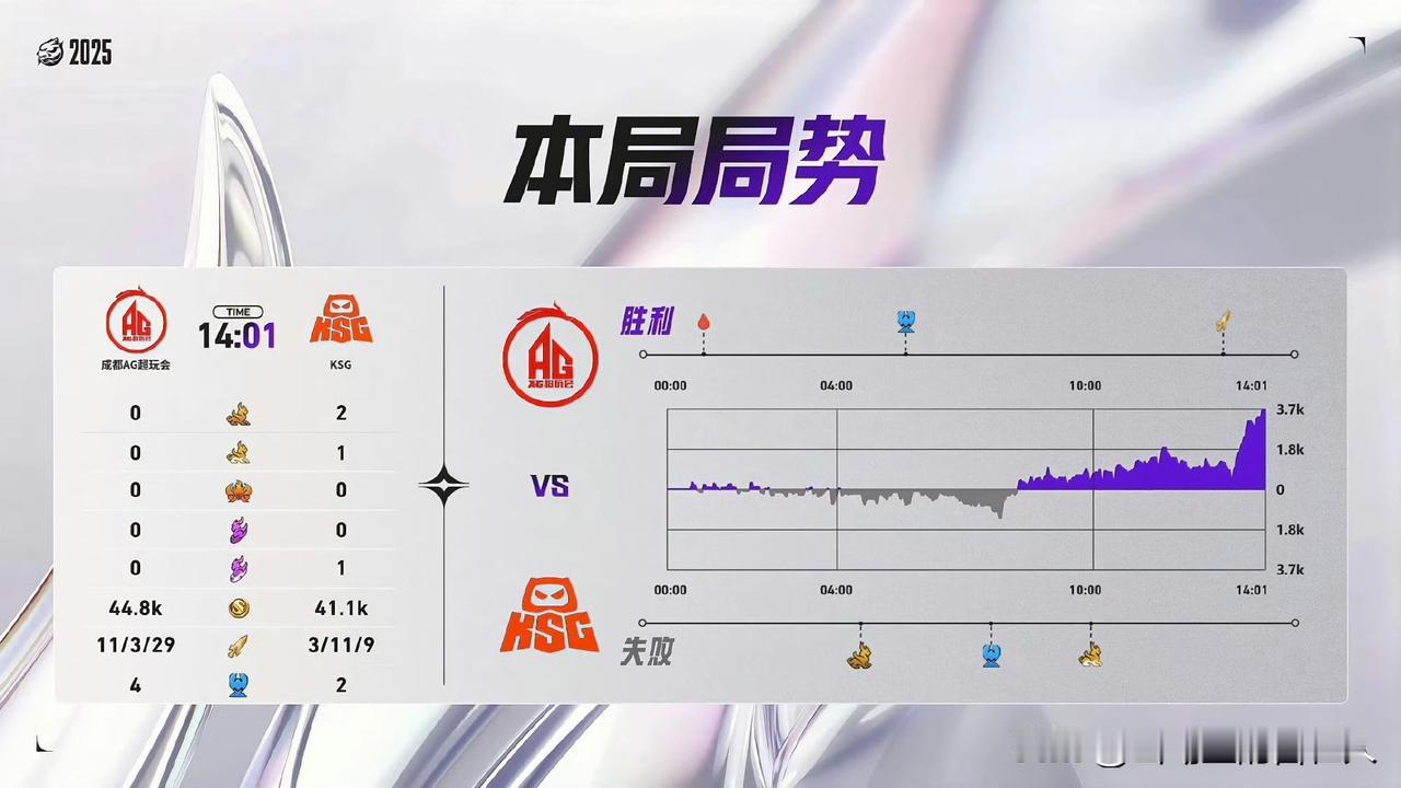 最近一次AG战胜KSG是2025年10月24日KPL年度总决赛胜者组半决赛,AG
