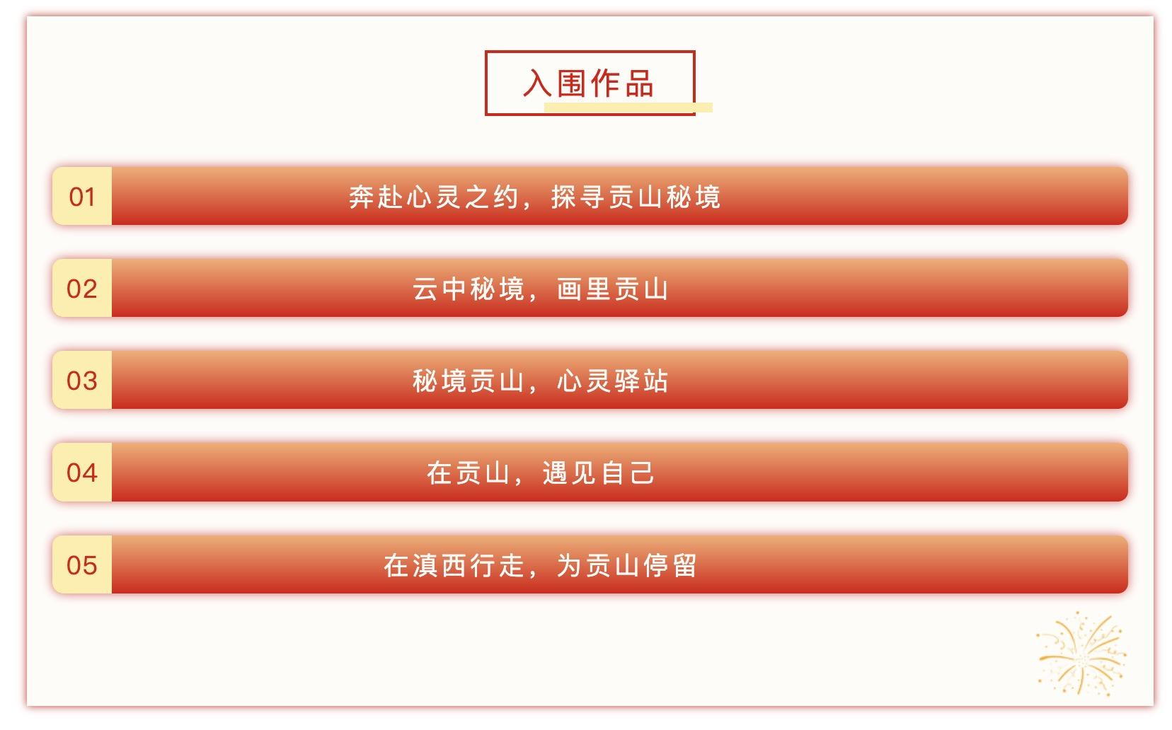 #官方回应文旅宣传语入围作品涉抄袭#【贡山文旅宣传语征集活动入围作品抄袭他人创意!获奖资格取消】12月21日,南都N视频记者从云南怒江州贡山县文化和旅游局获悉,近日,该局在“贡山县文旅形象宣传口号征集活动”获奖名单公示期间收到实名举报,核查后发现,活动入围作品“在滇西行走,为贡山停留”与阿坝州旅游形象新logo、宣传语征集活动“入围奖”作品存在高度相似性,已取消该作品的获奖资格。南都N视频记者 肖玥