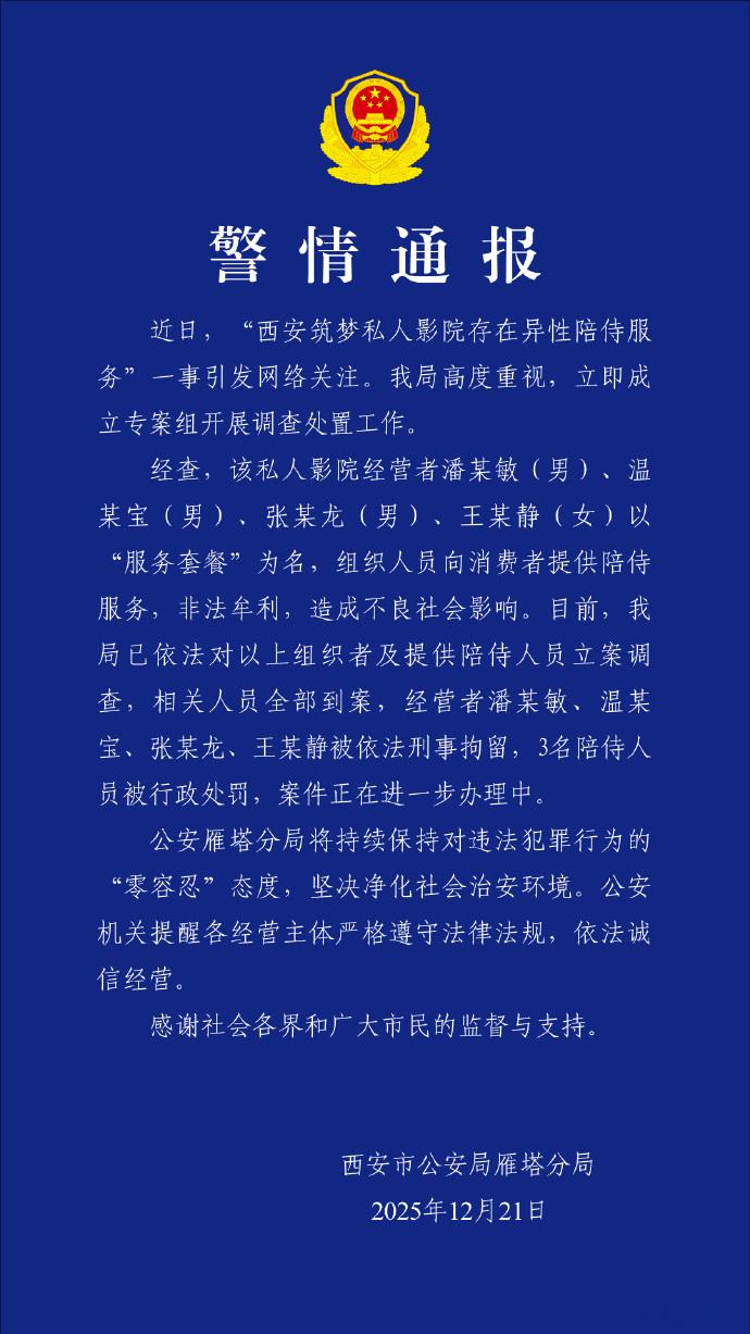 12月21日,西安市公安局雁塔分局发布警情通报称,近日,“西安筑梦私人影院存在异性陪侍服务”一事引发网络关注。我局高度重视,立即成立专案组开展调查处置工作。