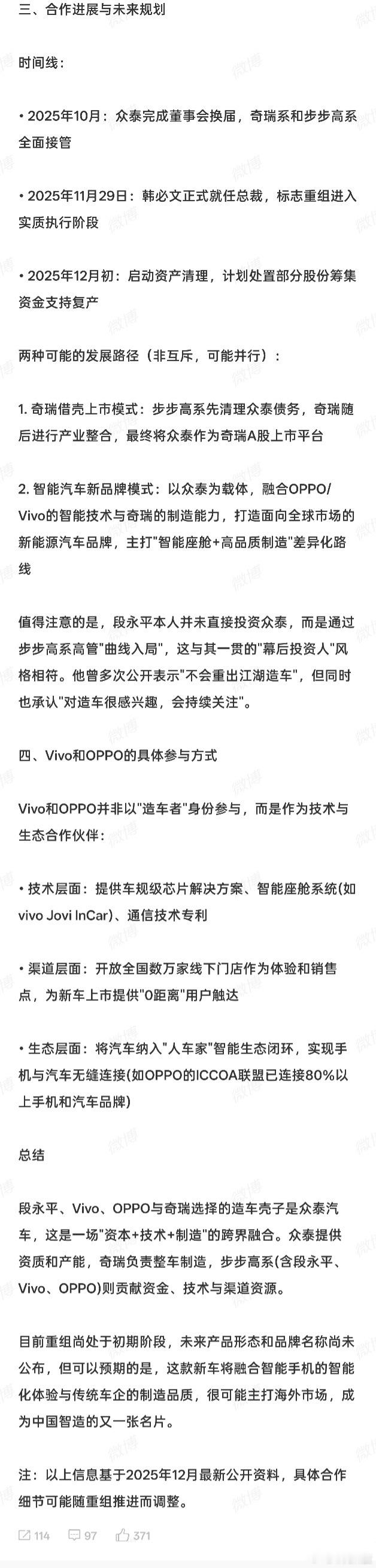 什么?OV要联合造车?据说段永平、vivo、OPPO与奇瑞选择的造车壳子是众泰汽车。众泰提供资质和产能,奇瑞负责整车制造,步步高系则贡献资金、技术与渠道资源。不可否认,目前新能源汽车产业是咱们国家未来10年的主旋律,各家都在抢占市场!步步高系现在开始进入新能源市场也不算晚,但目前已经是红海了!华为系的五界二境势头太猛了,再加上小米小鹏理想蔚来和一些老牌车企,整体市场厮杀比手机还要残酷很多!再加上目前新能源用户都无比看中智能座舱与智驾辅助,OV系都是零基础零沉淀零数据,个人觉得这是目前最大难题!看段永平如何破局吧!