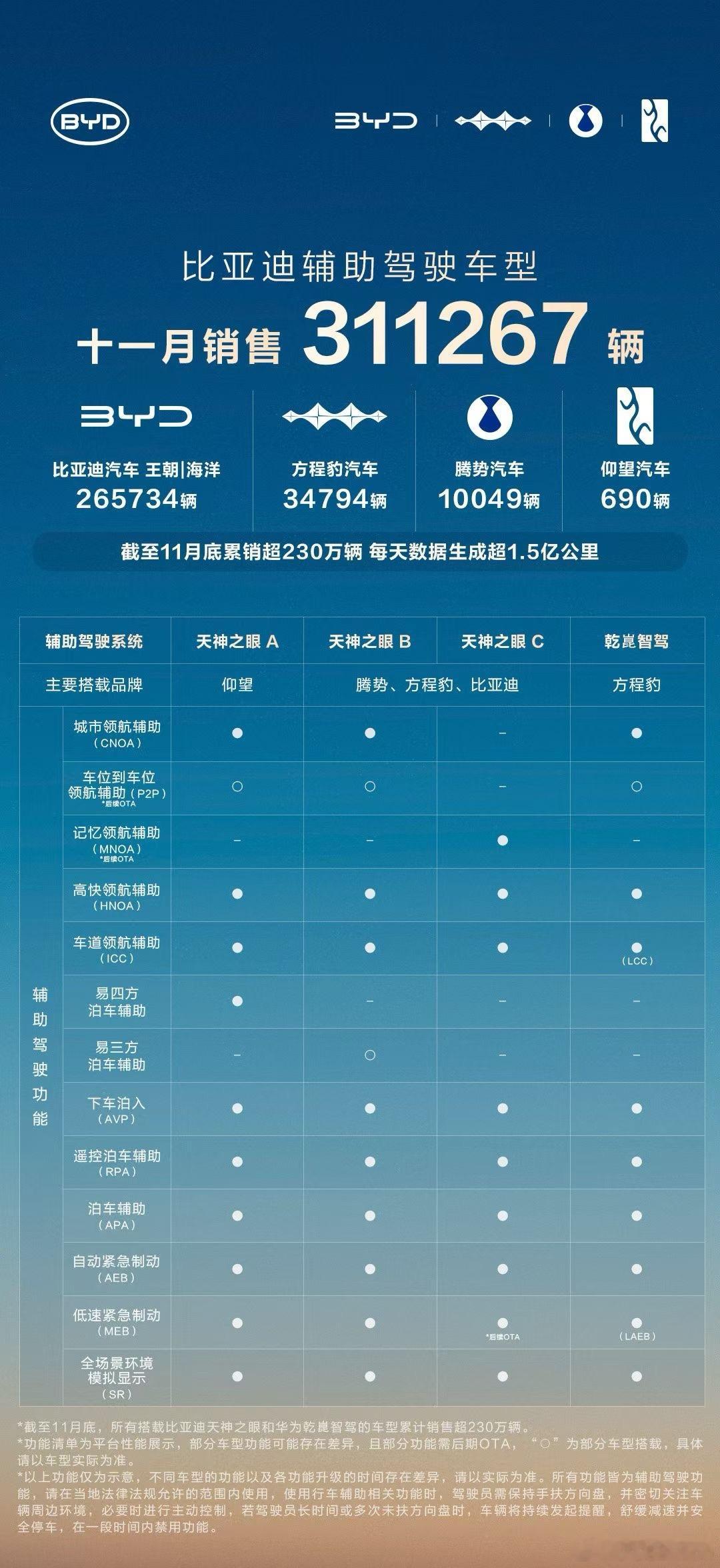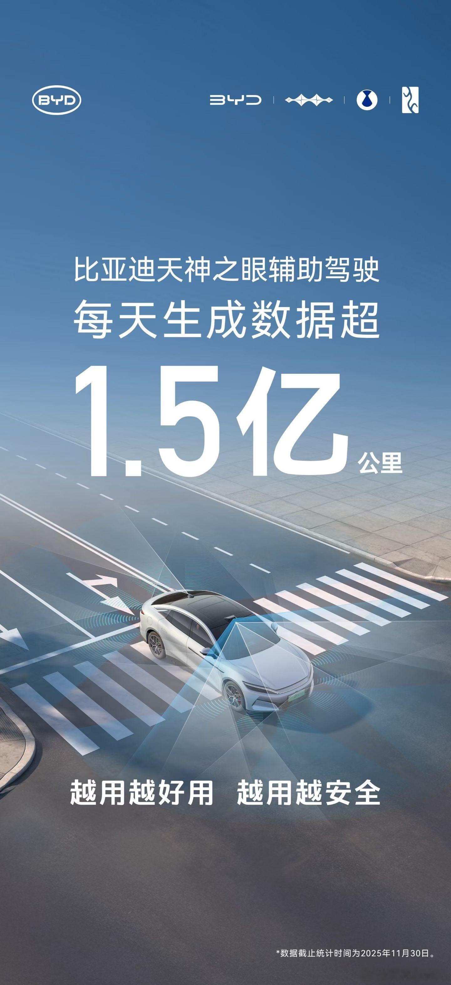 近日,比亚迪公布11月销售数据,搭载天神之眼辅助驾驶系统的车型全月销量达311267辆,成绩斐然。截至2025年11月底,此类车型累计销量突破230万辆,持续领跑中国辅助驾驶车型销量及系统装车量榜单,加速普及辅助驾驶的步伐愈发坚定有力。庞大的用户群体为比亚迪积累了海量真实道路数据,“天神之眼”系统每日生成超1.5亿公里辅助驾驶数据,为AI大模型训练迭代筑牢根基,让辅助驾驶更拟人、更安全,用户体验持续优化。在技术进阶路上,比亚迪始终将安全置于首位。今年7月,率先承诺对“天神之眼”车辆泊车辅助场景下的安全及损失全方位兜底,赔偿无上限且不限首任车主,尽显技术自信与对用户安全的高度负责。自下半年起,比亚迪多次大规模推送OTA更新,从主动安全到行车功能,再到座舱体验,全方位升级,让用户及时享受技术进步成果,践行“好的技术,人人可享”理念。市场反馈有力证明,“天神之眼”凭借稳定可靠与全面安全保障,赢得消费者广泛信赖,成为助推比亚迪车型热销的关键因素。在比亚迪等头部企业推动下,智能辅助驾驶正从“亮点配置”转变为购车“核心考量”,加速驶向更广阔的市场未来。