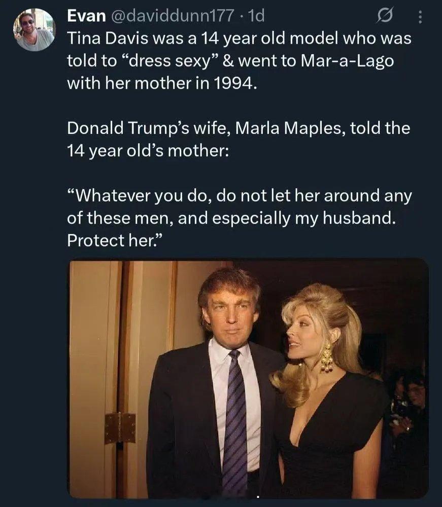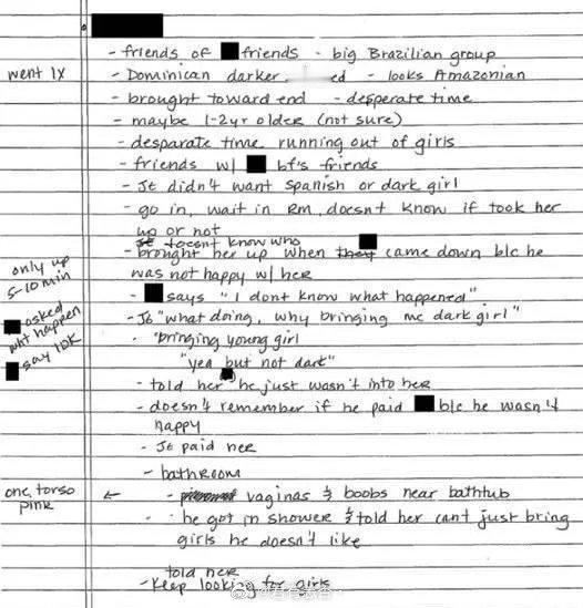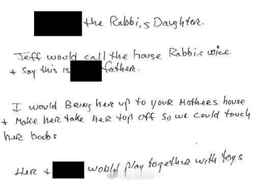 爱泼斯坦案法庭文件关于特朗普摘录:图1、2 在多伊(化名)与爱泼斯坦的一次会面中,他带她去了海湖庄园,并向庄园主人唐纳德·J·特朗普介绍了她。当爱泼斯坦向特朗普介绍14岁的多伊时,爱泼斯坦捅了捅特朗普的胳膊,调侃道:“这孩子不错吧?”特朗普微笑着点头表示赞同。两人相视而笑,而多伊感到不适,但当时她年纪太小,无法理解其中缘由。图3: 聚会后期缺女孩,人家领进来一个多米尼加的女孩子,爱泼斯坦嫌她肤色太黑,很不高兴。特总不喜欢黑女孩。图4:爱泼斯坦玩一个拉比(犹太教士)的女儿,让她脱掉上衣摸她的胸部。