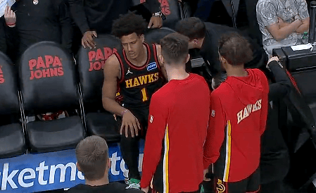比赛的第二节,杰伦-约翰逊突破上篮失去平衡重重倒地,目前仍在场上比赛。