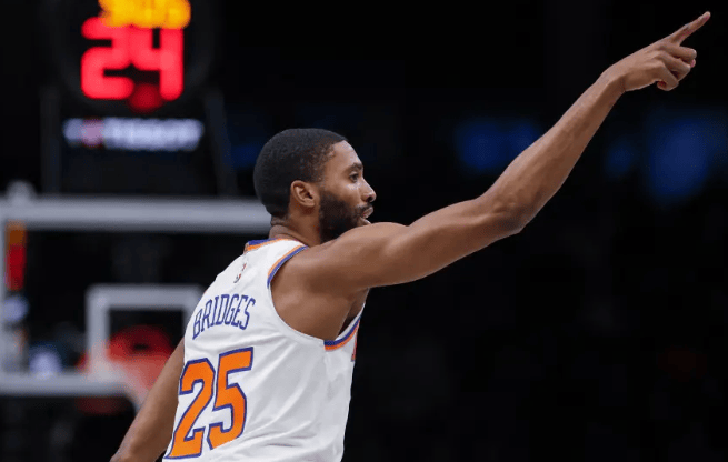 尼克斯球员米卡尔-布里奇斯本场比赛首发登场40分钟,全场14投9中,三分7中6得到24分2篮板4助攻。