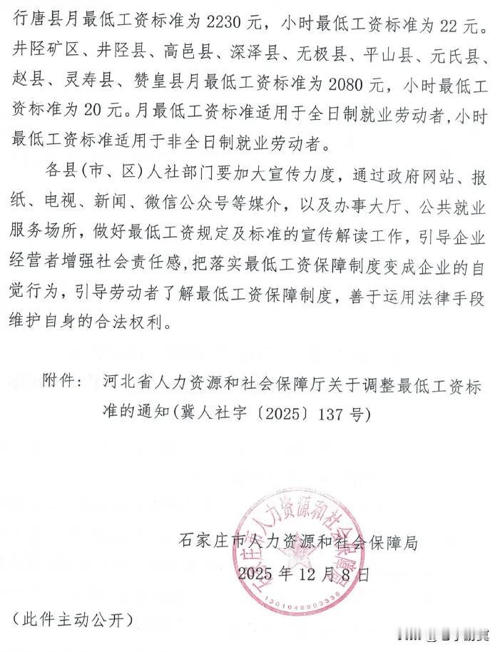 【石家庄上调最低工资标准!】石家庄市自2025年12月1日起调整最低工资标准,分为三档:市区(不含井陉矿区)和正定县执行第一档,月最低工资2380元、小时24元;晋州、新乐、行唐县执行第二档,月2230元、小时22元;其余县区执行第三档,月2080元、小时20元。调整后标准适用于全日制或非全日制劳动者,包含个人社保费用但不含加班费、津贴等。各县区需加强宣传和监管,确保政策落实。