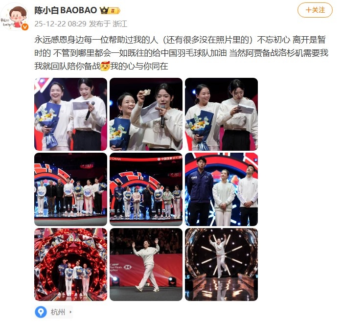 直播吧12月22日讯2025年世界羽联世界巡回赛总决赛在杭州收官。比赛全部结束后,奥运冠军陈清晨、郑思维、黄雅琼和刘雨辰出席运动员退役仪式。陈清晨社媒分享退役仪式现场照片。