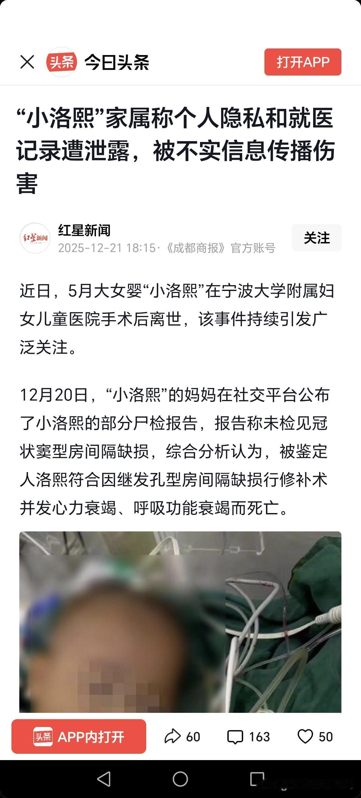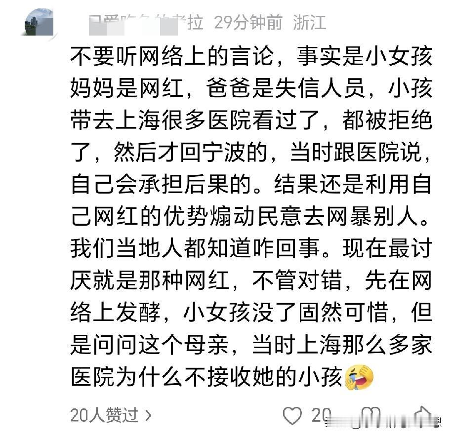 随着小洛熙事件舆论发酵,浙江很多网友就开始曝光小洛熙父母的黑料了,说他们在本地不是什么好人,其中还有人爆出了小洛熙就诊记录,还说他们其实去过很多医院看病,大上海也去过了,但都被拒绝了,是他们坚持要做的手术。 现在出事了就利用自己是网红的身份,利用网络舆论的优势煽动舆论。 说实话,本来活生生的一个孩子,就这样没了,作为父母,真的很心痛,一个家庭孩子没了,等于天都塌了,他们也就是想为孩子讨个公道,还原真相而已,他们也不是不想通过正常的方式去追究责任,问题是医生不老实,明明手术没成功,却说成了成功,而且病历还被篡改,他们想要当地公安机关介入调查,想调取相关的监控视频,却被告知没有,没有储存设备,已经看不到监控了,那怎么办呢? 单靠医务人员的回忆么?证据链已经缺失了,这种情况让父母如何是好? 他们为了追寻真相,只能找到异地的权威机构进行尸检,做出这样的决定,其实真的不容易的,毕竟对孩子又是再一次的伤害,但是如果不及时进行尸检,那可能就不知道真相,毕竟尸检是越快做越好,拖的太久会影响死因的准确性啊。 孩子冻了又解冻,然后还要一刀刀剖开来,一点一点来判断,这对于父母来说是怎么样的一种煎熬?真的难以想象! 他们找了全国知名的一个权威机构来判定,也是避免当地公信力的争议,为后面打官司提供了有效的证据,保存这些证据之后,孩子也能够尽快入土为安。 所以我不理解为什么当地人要网暴他们,正因为他们是网红,这个事情才得以曝光,而这个手术,跟之前在哪个地方看过没有直接关系,毕竟是医生同意去做这个手术,这个手术已经很成熟了,那这个手术的成功与失败就是主刀医生的判断和技术问题了! 现在尸检的结果已经很明确了! 所以我觉得他们没有做错的地方,他们只想为女儿发声,他们是利用科学和法律,寻求一个真相,为死去的女儿讨个说法而已!失去孩子,他们已经很痛了,捅破这样的医疗事故真相,他们不仅只为自己的孩子发声,难道他们不也是为我们发声吗?所以为何还要网暴那些为正义发声的人呢?