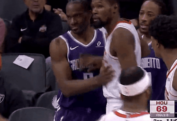 第三节比赛,杜兰特防守中撞倒阿丘瓦,随后主动走向后者友好示意。