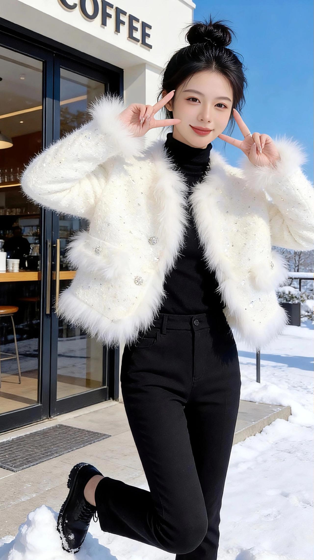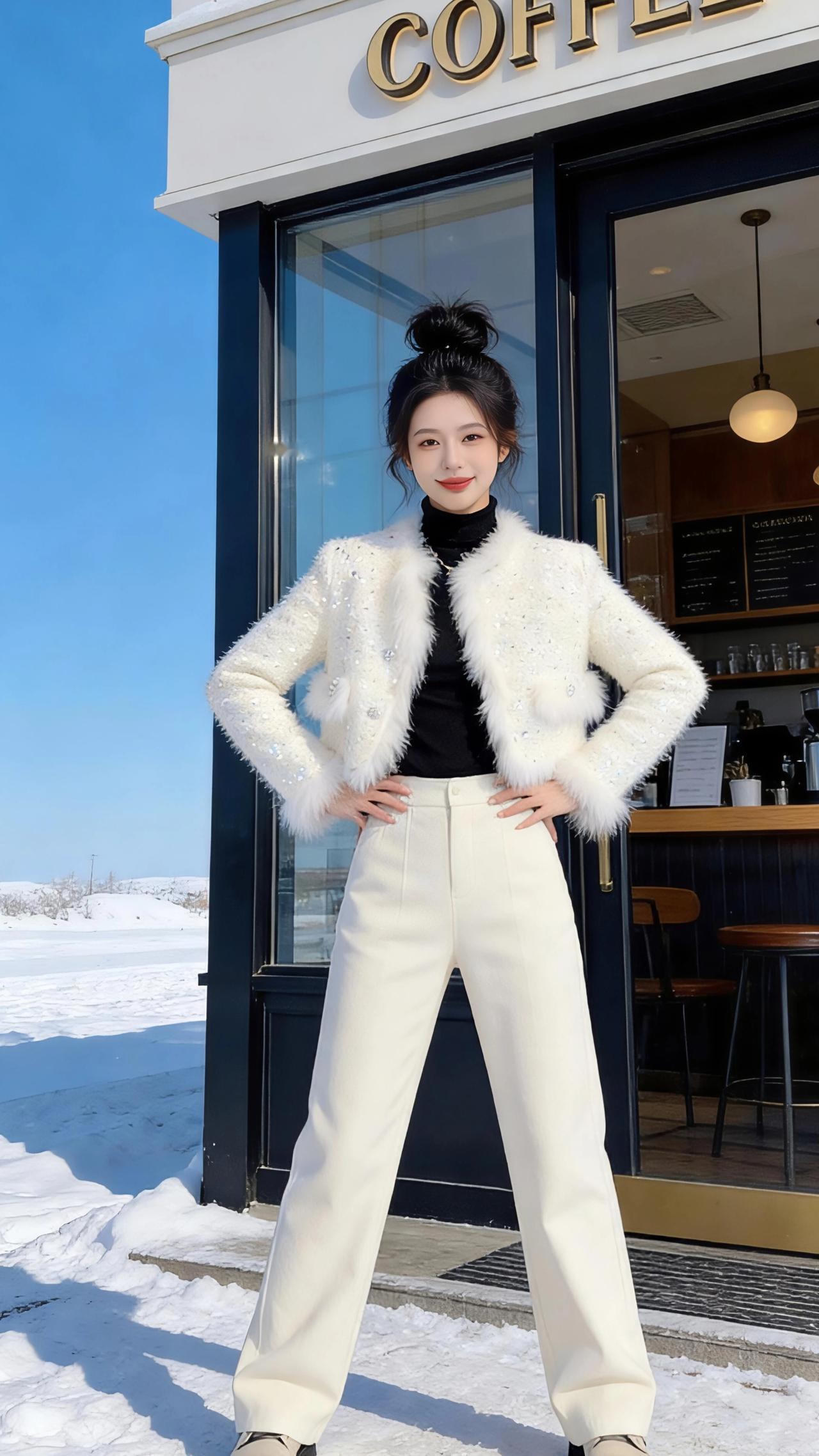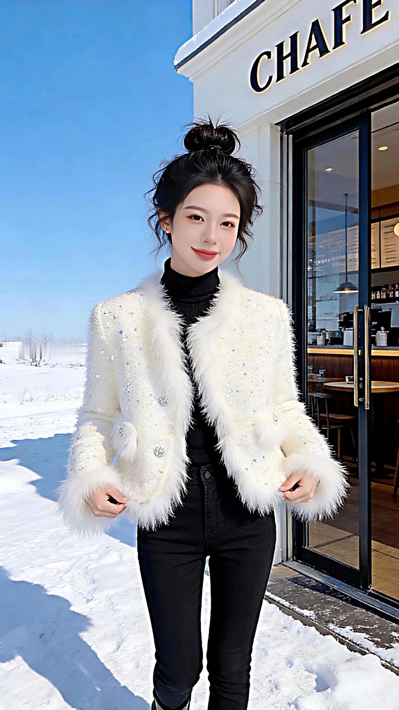 雪日咖啡馆外 冬日的风裹着碎雪掠过街角,咖啡馆的玻璃门映着澄澈的蓝空,鎏金的“COFFEE”字母在雪光里晃出温柔的弧。 我立在雪地里,白绒外套的毛边沾了细碎的雪粒,像缀了星子。黑色高领裹住颈间的暖意,与纯白的雪、奶白的衣摆撞出利落的层次。发髻高高挽起,碎发被风拂得轻扬,抬手触到耳际时,指尖掠过的凉意里,混着咖啡香从门内漫出的甜暖。 脚下的雪踩出松软的声响,阳光斜斜打下来,把身影拓在雪地上,也让外套上的碎钻闪着细碎的光,像把冬日的暖阳揉进了衣料里。我扶着冰凉的金属门把,转头望向远处被雪覆盖的旷野,天地间只剩蓝与白的交响,而这街角的暖意,成了冬日里最温柔的锚点。 高级感穿搭 时尚穿搭 新年穿搭 小个子穿搭