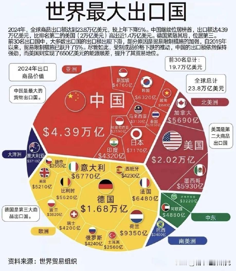 2024年我国出口额达到了4.39万亿美元排名世界各国出口额的榜一,按人民币计算