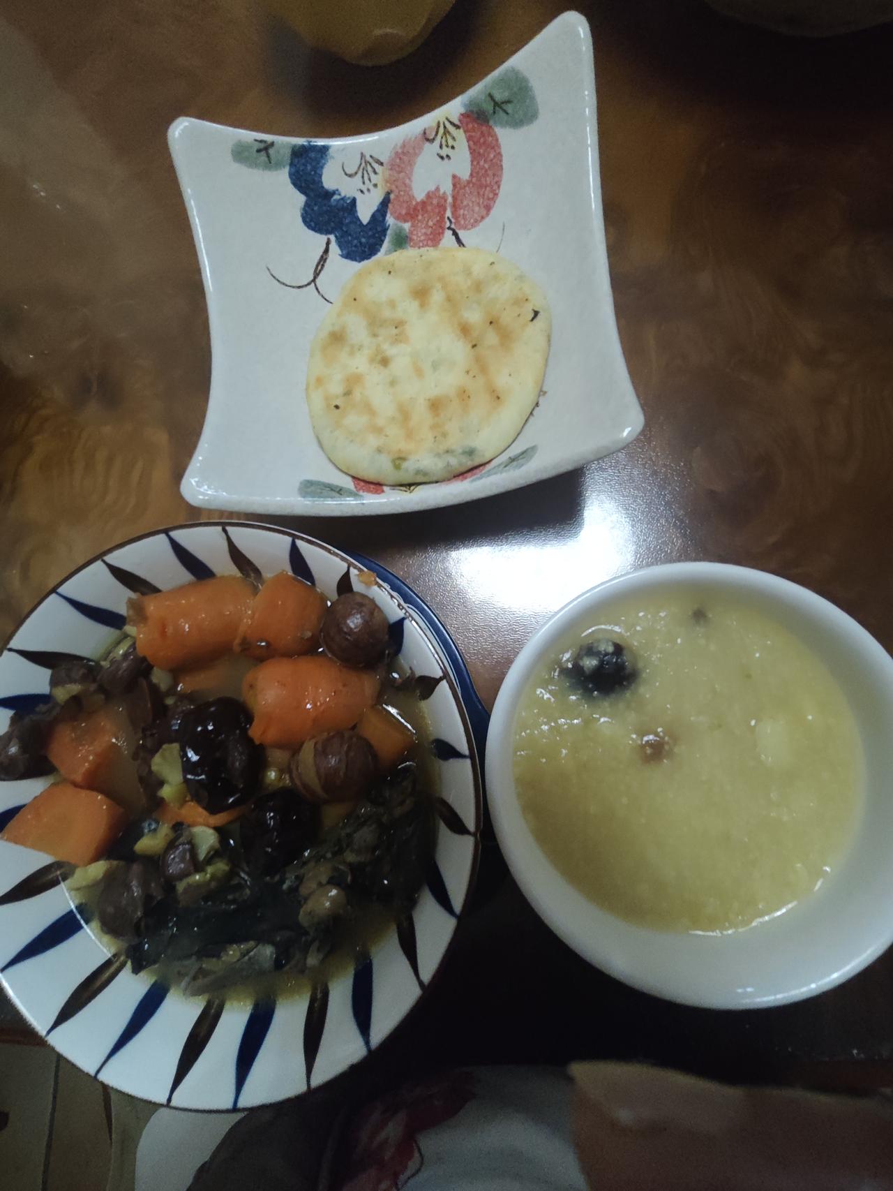 六十多岁老两口的午餐 昨天冬至吃饺子剩余的饺子馅,老公午餐把它们包成馅饼,另外炖了半只乌鸡汤,乌鸡汤里加了很多付菜,熬了一小锅小米山药红枣粥,既简单又方便,还有营养。 人到中老年以后,最好不要像年轻一样点外卖,自己做既经济又实惠,我们也不讲究什么好看和什么仪式感,只要适合我们少油少盐以清淡为主就行了。毕竟身体健康最重要,吃完收拾一下,午觉过后,有劲锻炼,有个好身体,比什么都强。
