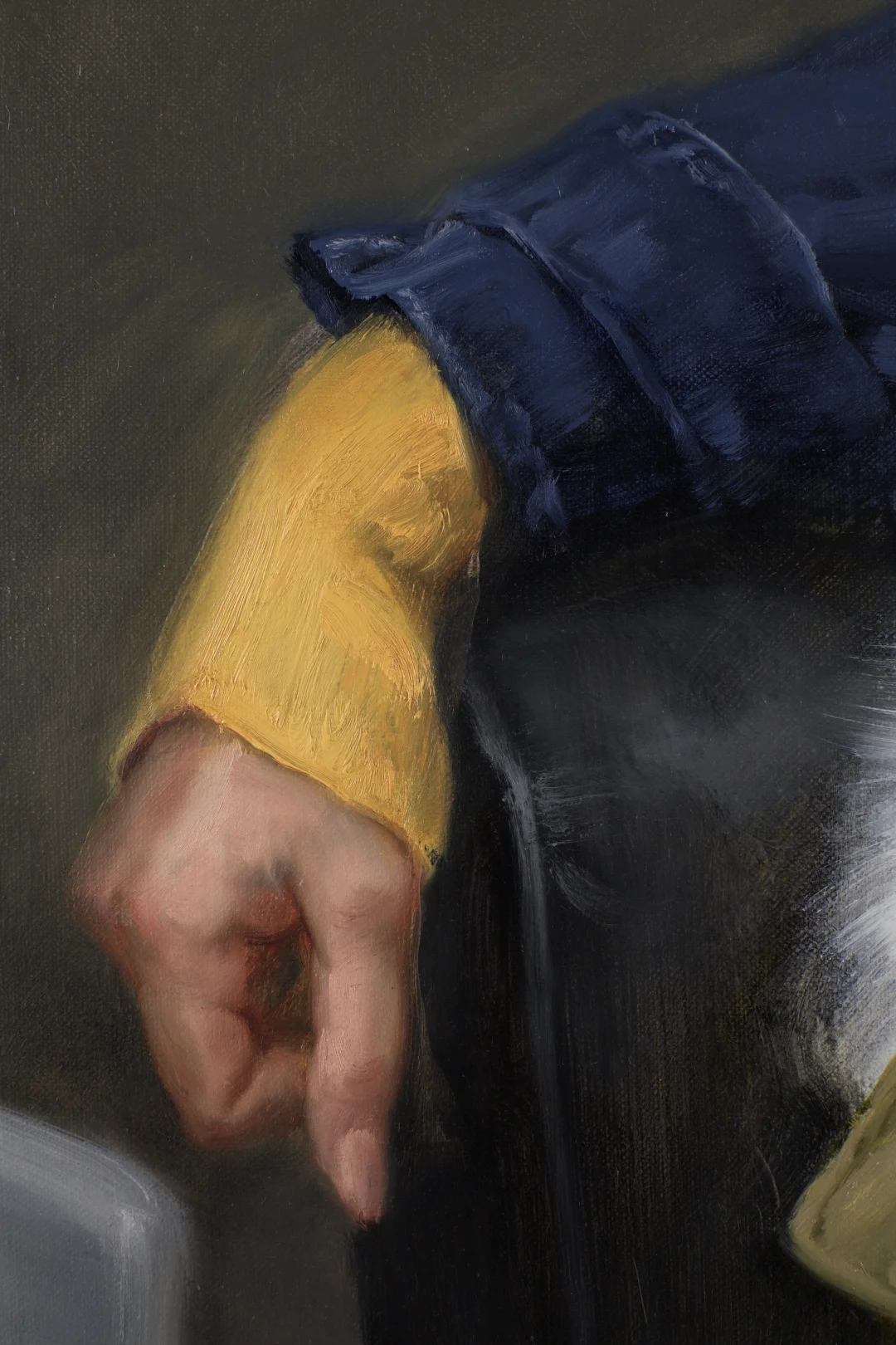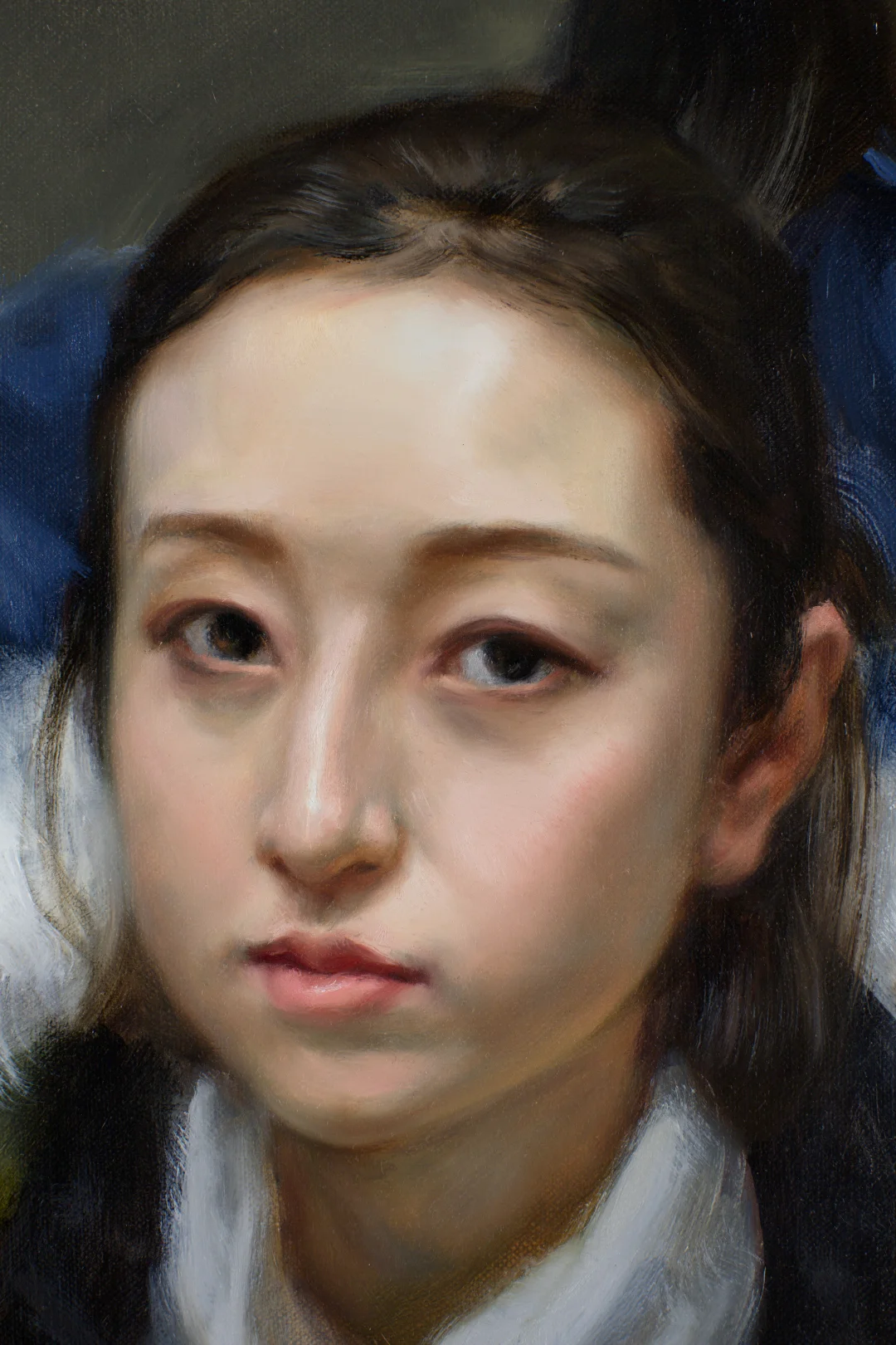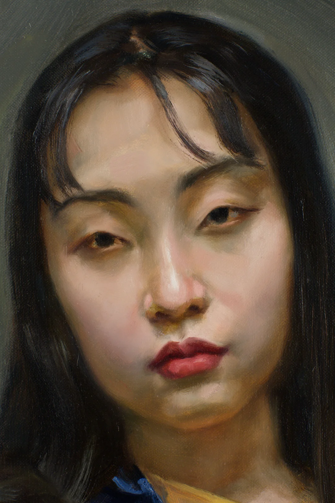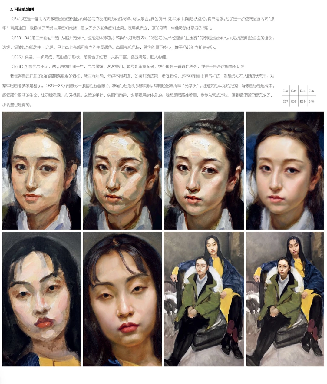 (E37—38)刻画另一张脸的五官细节,净笔与扫连的步骤同前。中间色透出冷调的“光学灰”。要注意把握内心的状态,肖像画必须是追魂术。感受眼前那个生命,让灵魂赤裸、心灵袒露。女孩的手指纤细而有韵律,也需要用心体会。我采用局部推进、步步为营的画法,画到哪里,哪里就算完成。当然,小调整也是有的。