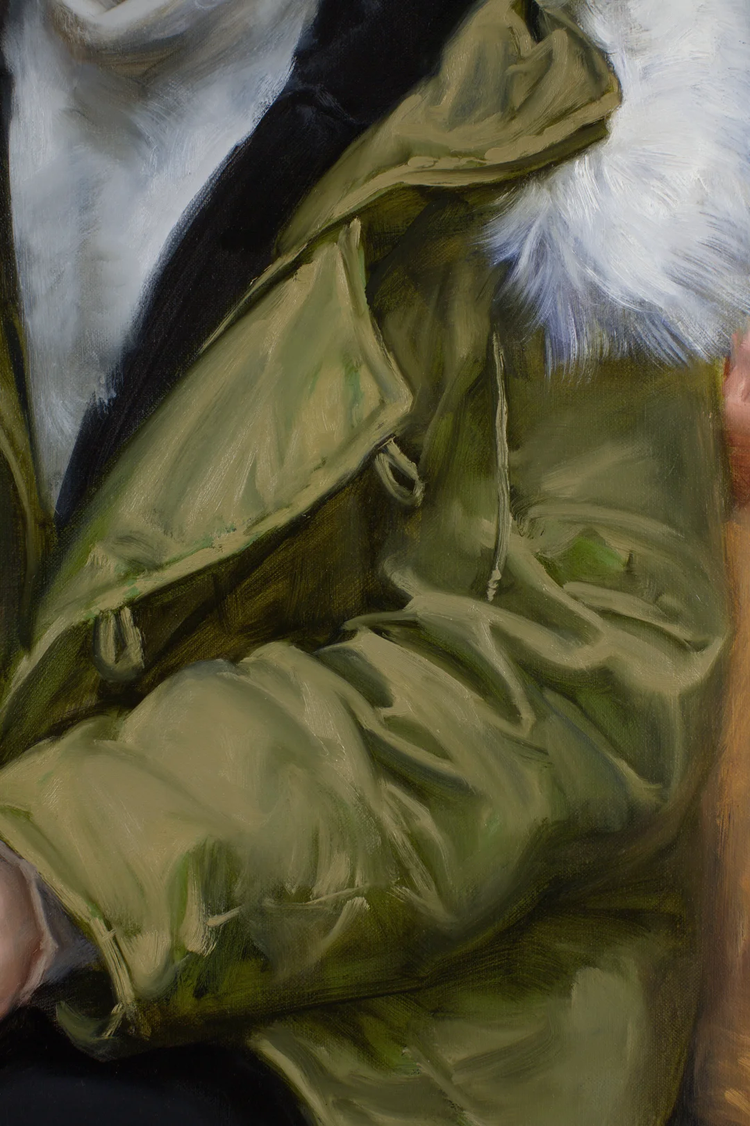 (E33—34)第二天画面干透,从脸开始深入,也是先涂薄油。只有深入时才用到媒介(调色油)。严格遵循“肥压瘦”的原则层层推进。接着用透明色画脸的暗部,边缘、缝隙以勾线为主。之后,立即点上亮部和高点的主要颜色。点画亮部色块时,颜色的量不能少,要堆在凸起的点和高光处。