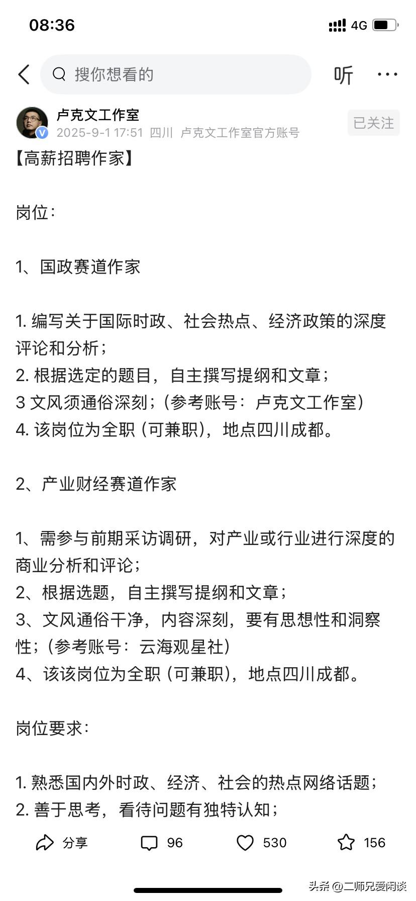 卢克文工作室招人啦 心想这么牛的工作室招人,那应聘者写作能力得多牛,这次招聘的人分为两类: 1、国际赛道:关于国际时政、社会热点、经济政策的。 2、产业财经类的作者。 并且可全职和兼职,这对于有某些领域有深耕有独到见解的人是个很好的机会,毕竟他这个工作室的流量在这呢。