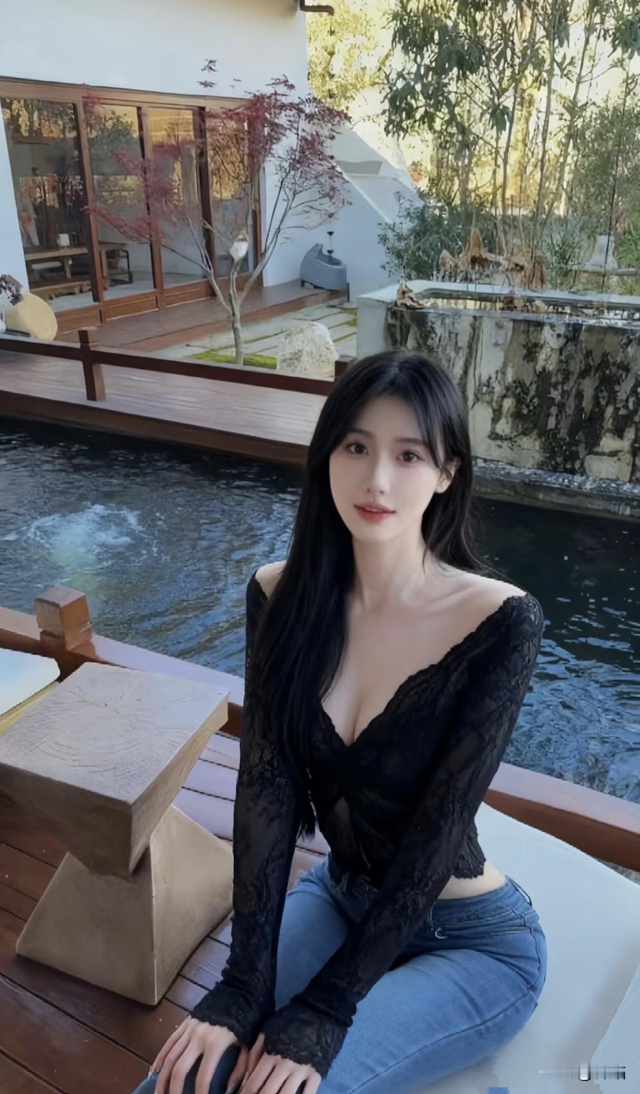 美图欣赏,看图写诗 《池畔墨影》 墨缕裁衣映水柔,青丝垂落晚风悠。 回眸一笑春波漾,静立池边意未休。 《黑纱与池光》 池水漾着日光的甜, 黑衫绕着肩上的绵。 发丝拂过风的软, 目光落处,是岁月的缓。 图片来源于网络