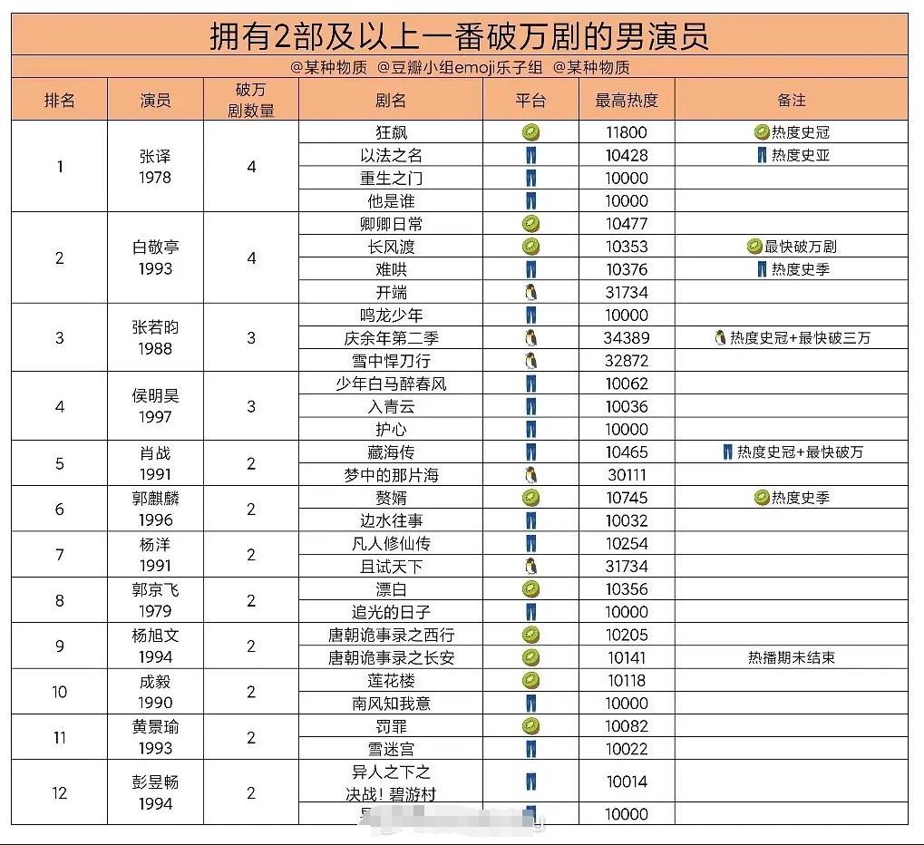 成毅《长安二十四计》优酷站内热度破万 这是他个人继《莲花楼》和《南风知我意》之后第三部一番热度破万剧,男演员一番热度破万剧最多的是白敬亭和张译,每人四部,然后是张若昀和侯明昊,三部破万,两部破万的有肖战,郭麒麟,杨洋,郭京飞,杨旭文,黄景瑜,彭昱畅等,含金量最高的还是白敬亭,有古偶,现偶还有悬疑,多题材多平台破万,且都是大爆剧,其他流量破万剧水分有点高,有些剧明显扑了,但热度破万了。