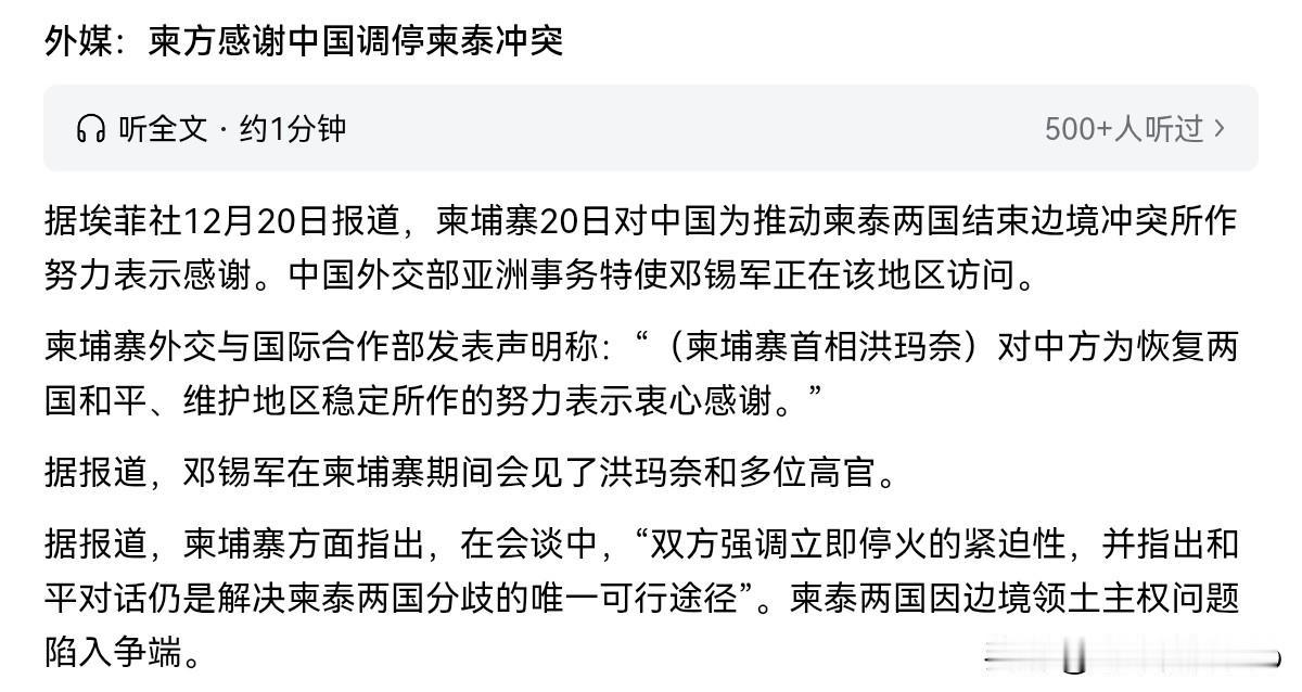 柬埔寨松了一口气!面对来访的中国特使,柬埔寨方面高度重视!12月22日,根据国内媒体报道,在我们的外交部亚洲事务特使邓锡军访问柬埔寨之后,柬埔寨专门发表声明表示,柬埔寨首相洪玛奈对中方为恢复两国和平、维护地区稳定所作的努力表示衷心感谢。而在此期间,包括洪玛奈在内的多名柬埔寨官员均与我们的特使举行会晤。 很显然,柬埔寨方面的这一态度,这传递出来的信息是什么呢?恐怕最起码有两点,其一,柬埔寨完全认可我们对于区域事务的斡旋能力,承认我们对于区域事务有重大影响力,而这也是借此强化与我们的关系。其二,柬埔寨的这一声明无疑是跟我们统一口径,柬埔寨希望借势中国,尽快实现停火止战。 事实上,就现实情况而言,泰柬冲突加剧以来,局势对于柬埔寨越来越不利,柬埔寨国内老百姓流离失所不说,包括洪马内的领导力也受到挑战。及时停战止损,完全符合柬埔寨的利益。中方的介入,不仅为柬泰双方搭建了沟通对话的桥梁,而且还能缓解战争带来的国内的民生压力、稳固执政根基,也能在复杂的地区博弈中占据主动,避免沦为外部势力的棋子。很显然,中方的出手,让柬埔寨松了一口气,这有利于停火尽快实现。