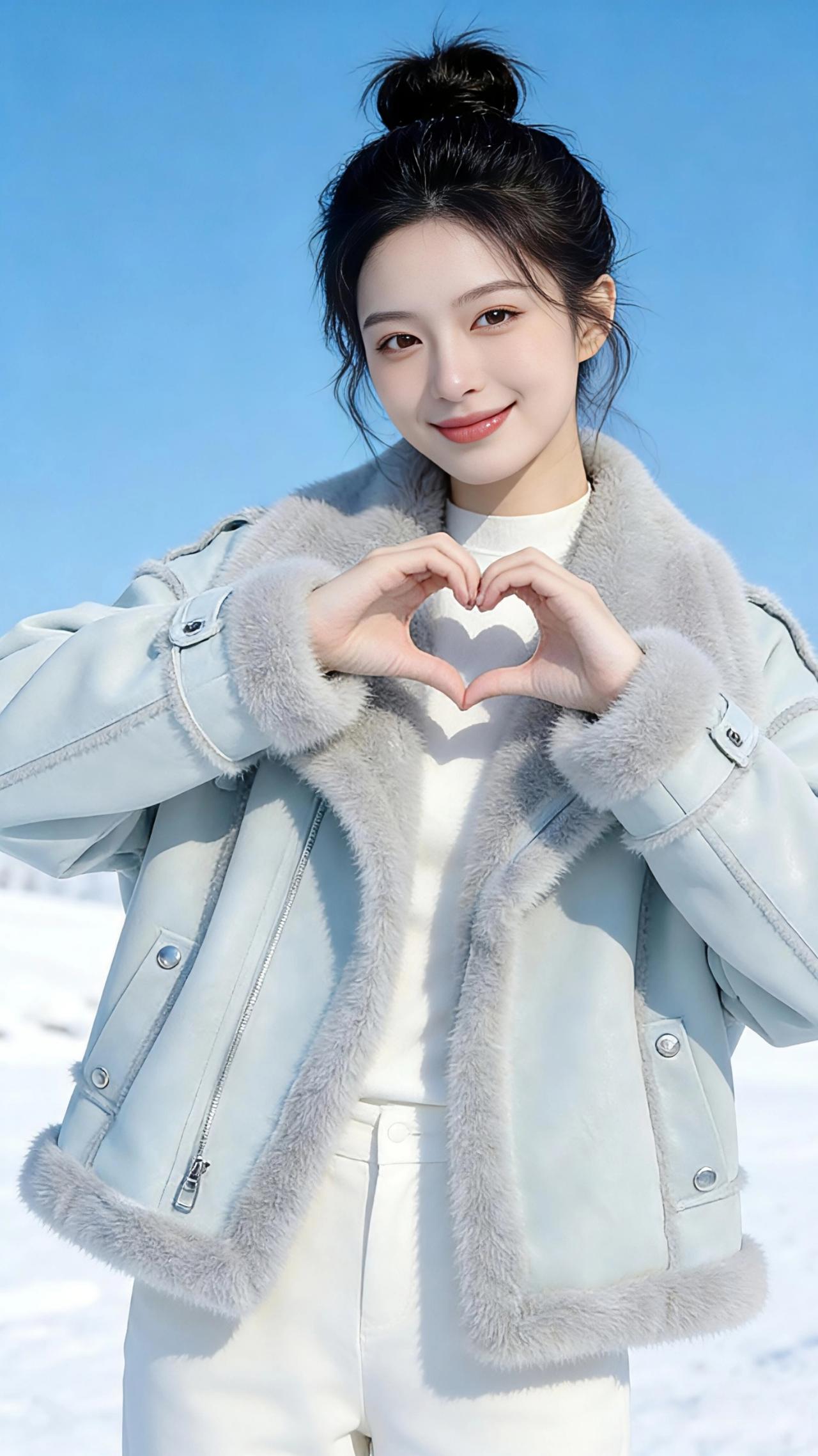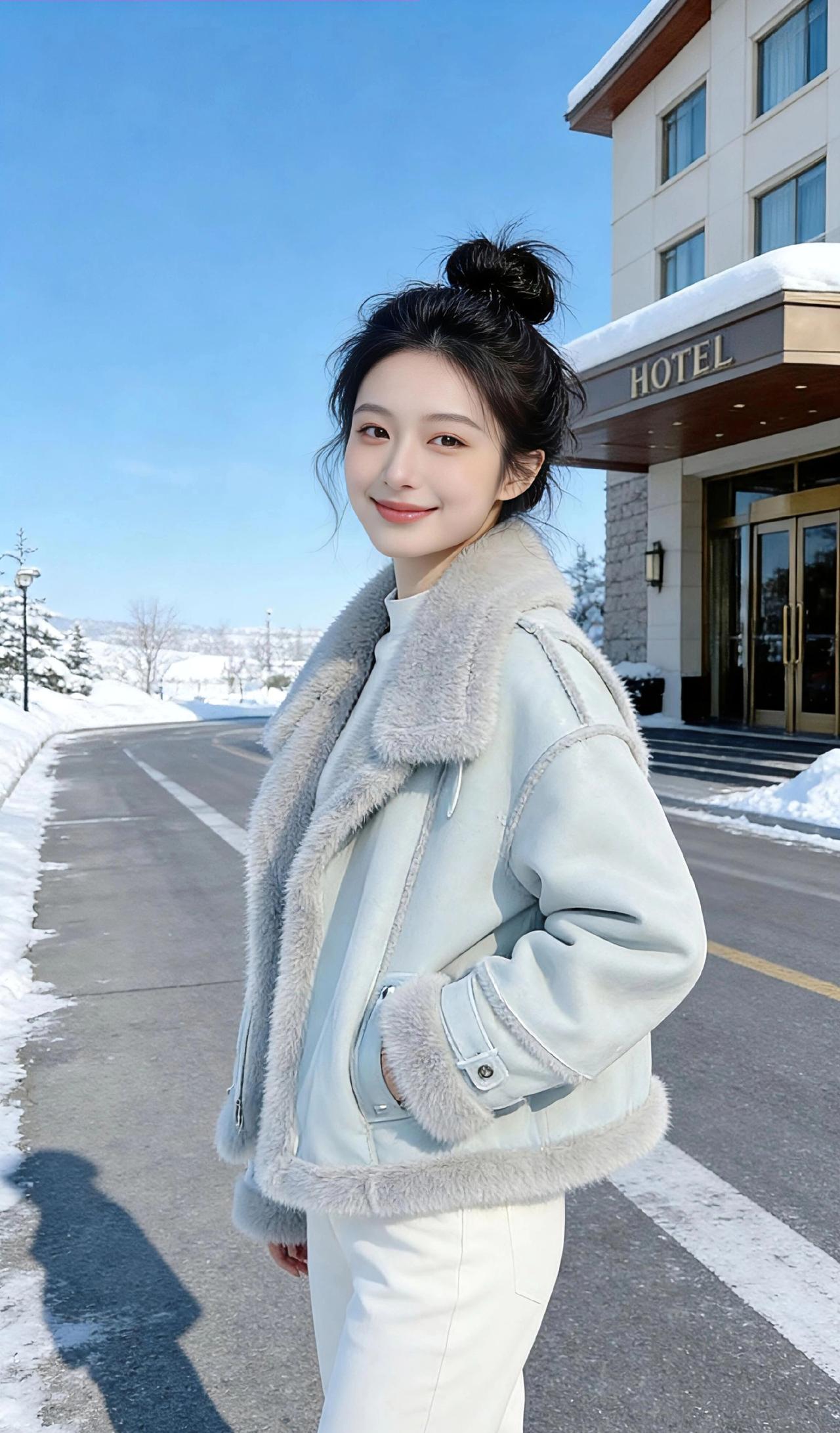 雪日晴风 冬日的风裹着碎雪的凉意掠过肩头,却被浅蓝皮毛外套兜住了大半。天空是洗练过的澄澈青蓝,像块刚化开冰的湖面,把雪地也映得发亮。 丸子头的碎发被风撩起,贴在耳侧,抬手拢了拢外套的毛领,软茸茸的触感蹭着指尖,暖意便从领口钻进来。酒店的石墙覆着薄雪,金色的“HOTEL”字母在阳光下晃着微光,脚下的路面残雪融成细碎的水痕,踩上去咯吱轻响。 站在这方雪色天地里,抬手比出心型,或是插兜笑着转身,风里的冷意都成了温柔的点缀。阳光斜斜洒下来,把影子拓在雪地上,这一刻的美好,就像雪后初晴的天空,干净又明亮,只余满心的轻快与欢喜。 高级感穿搭 时尚穿搭