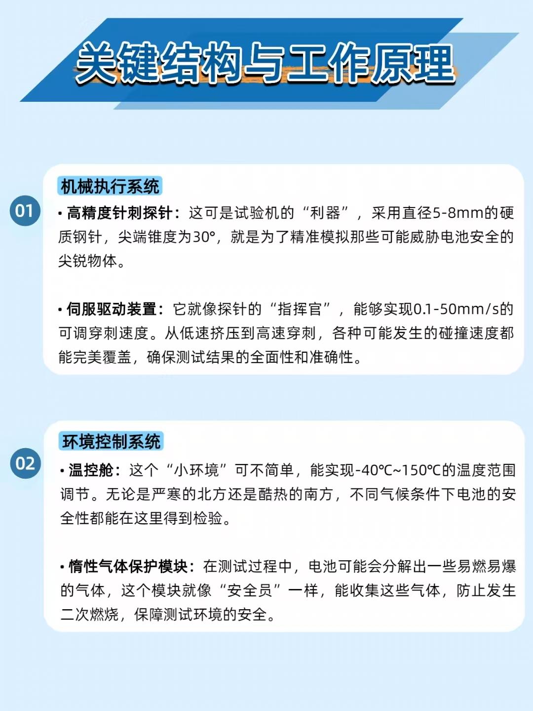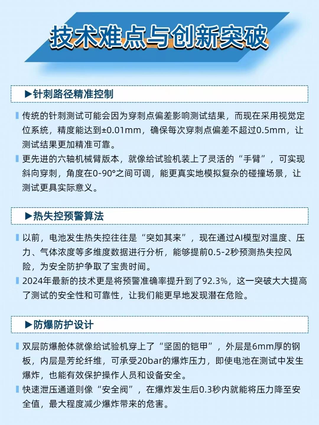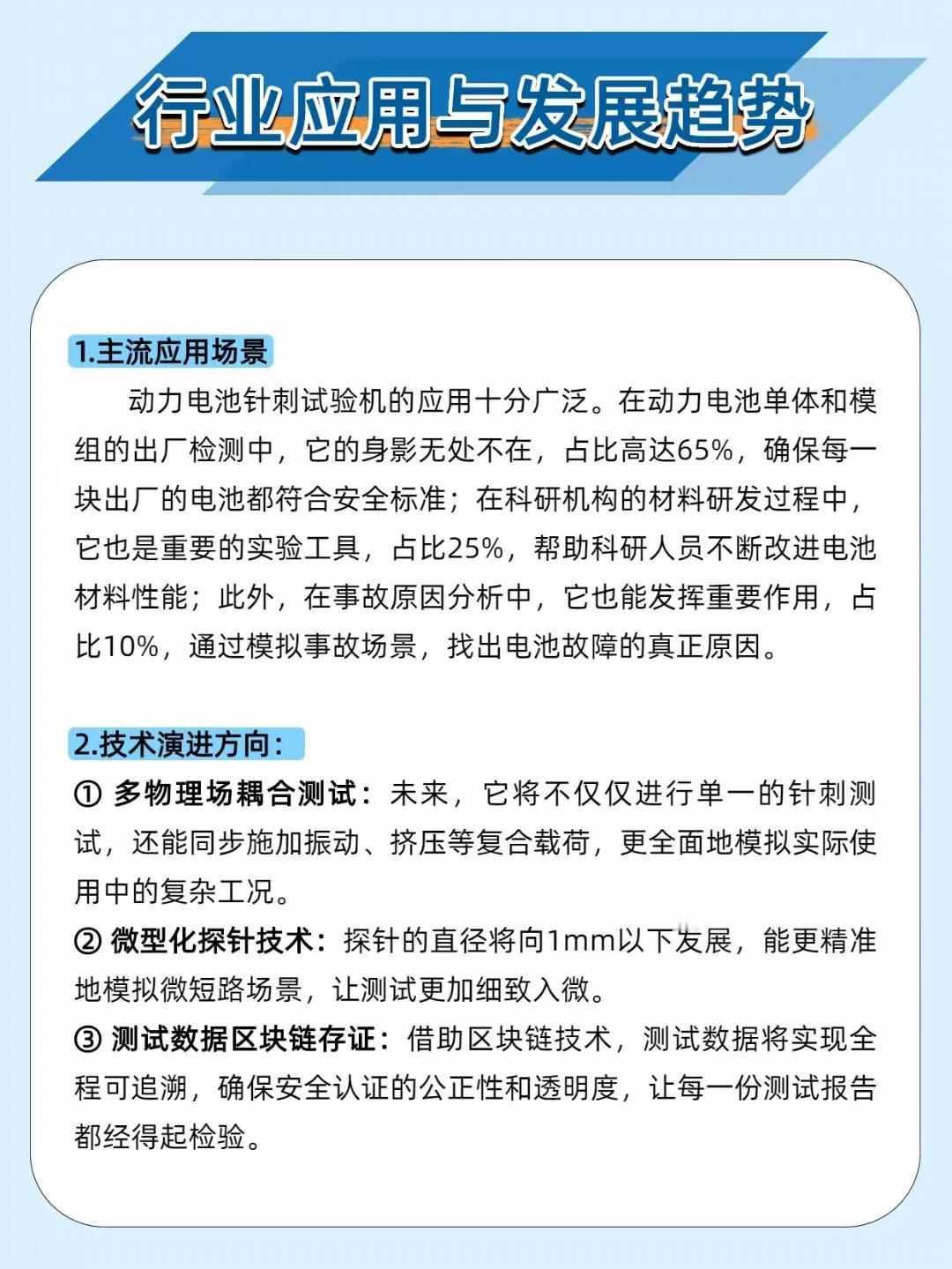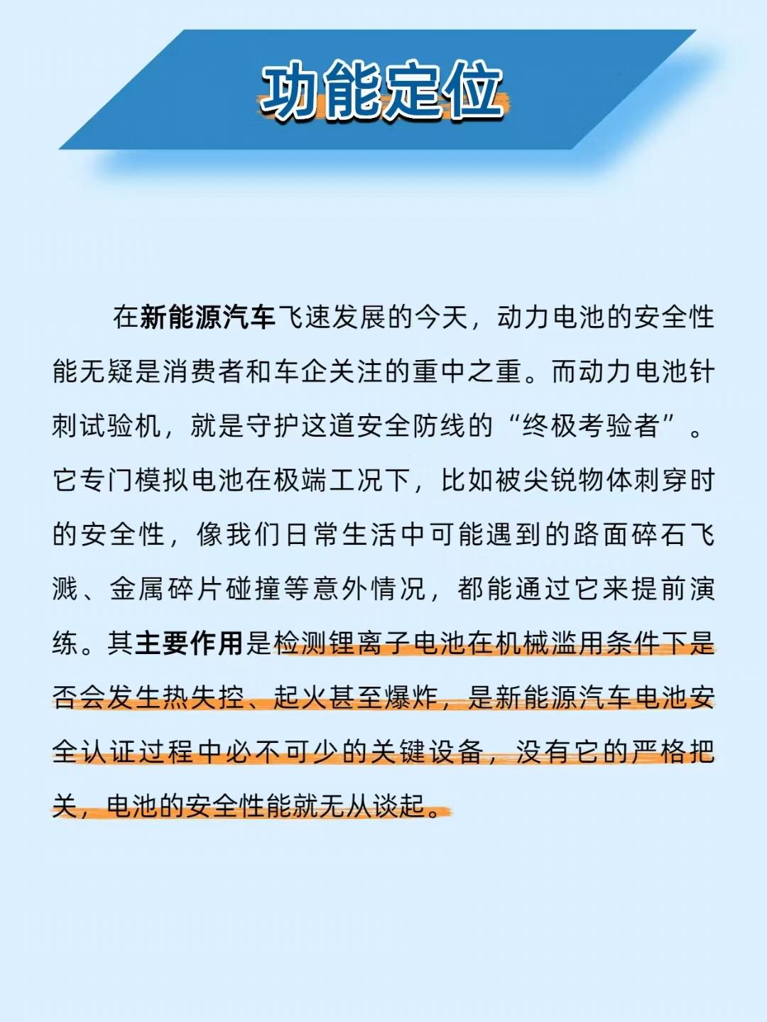 《新能源车电池被扎会炸?这设备是电池安全的 “终极考官”!》 买新能源车最慌啥?电池被碎石扎了、碰撞后起火爆炸!而每块动力电池出厂前,都得经【动力电池针刺试验机】的 “地狱级考验”—— 它是守住电池安全的 “钢针考官”!💥 这设备专干 “狠活”:用硬钢针模拟碎石 / 金属碎片穿刺电池,测极端情况下会不会热失控、起火。像冬天冻到 - 40℃、夏天烤到 150℃的环境,都能模拟出你日常可能遇到的糟心场景。 ————————————————————————————————— 它的 “考试工具” 超硬核: 🔪“钢针刺客”:直径 5-8mm 的硬钢针,精准扎穿电池,模拟各种尖锐物撞击 🌡️“冷热考验箱”:从极寒到酷热,测不同气候下电池的抗造性 🕵️“安全侦探”:红外热像仪盯温度、气体分析仪查有毒气体,穿刺后盯 1 小时看会不会炸 ————————————————————————————————— 考过了才让上车: 穿刺后监测 1 小时,没热失控、没起火 —— 这电池才算 “安全合格”,能装到你买的新车里。现在还升级了 AI 预警,能提前 0.5-2 秒预判危险,防爆舱更是能扛住爆炸压力,安全感拉满!