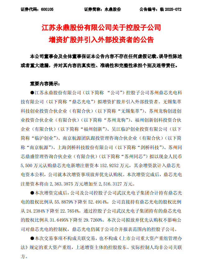 12月22日,永鼎股份(600105.SH)公告称,公司控股子公司鼎芯光电拟增资扩股并引入外部投资者,包括无锡集萃、苏州龙驹、福州创新、临沪创业、南京航源、剑桥科技(603083.SH)和苏州同芯等,合计现金增资5500万元。增资完成后,公司及控股子公司合计持有鼎芯光电的股权比例从55.8879%下降至52.4914%,公司直接持有的股权比例从24.2384%下降至22.7654%。
