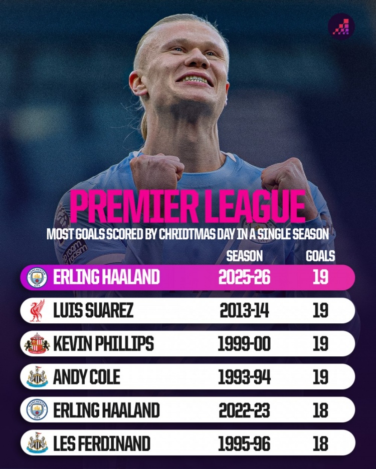 直播吧12月22日讯英超17轮过后,目前曼城前锋哈兰德以19球领跑射手榜,领先第2名伊戈尔多达8球。据Opta数据统计,在圣诞节前英超单赛季历史射手榜中,哈兰德、苏亚雷斯、安迪·科尔、凯文·菲利普斯各19球排名第1。