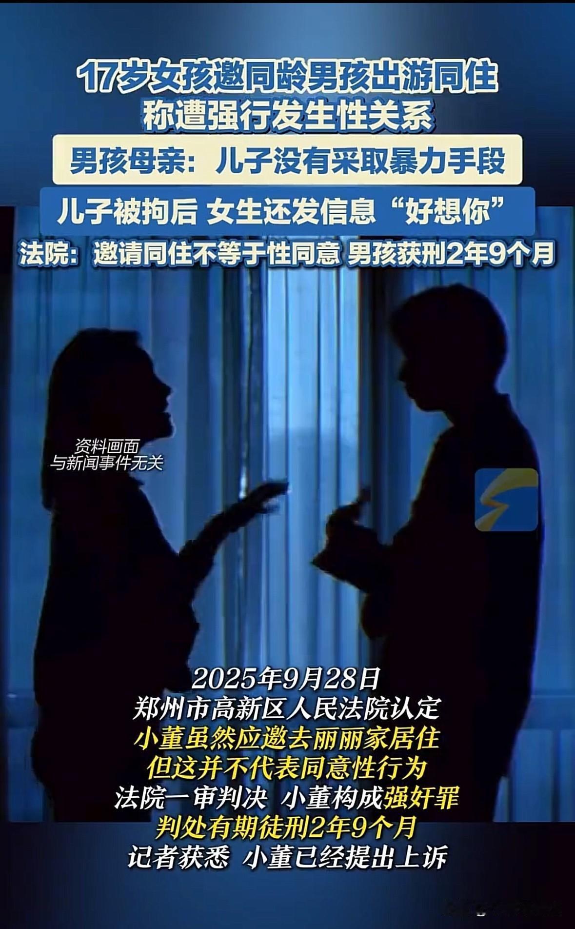河南郑州,17岁女孩邀请17岁男友同游,并让男友住在自己家。女孩跟男友商量好分房睡,男友以为女孩腼腆,就留在女孩房中并与其发生关系,事后女孩报警称男友性侵。男友母亲声称没有采取暴力手段,且在拘留期间女孩还发信息说好想男友,法院判决引发热议。   在2024年7月,17岁的小董和17岁的丽丽相识,短暂的接触后,两个人对彼此颇有好感,就朝着谈恋爱的方向在相处。   17岁正是爱情荷尔蒙最旺盛的年纪,7月份又是盛夏时节,在炎热的天气和热烈的感情催化下,小董和丽丽很快就确定了恋爱关系,正式成为了男女朋友。   虽然确定了关系,但是总是通过网络和电话沟通感情总是觉得少了点什么,于是两个人相约见一面,也算是在一起后的约会旅游了。   但是旅游地点的选择却让两个人犯了难,小董在许昌,丽丽在郑州,距离还可以,但丽丽不太愿意舟车劳顿,破坏心情,所以就只能是小董到郑州找丽丽。   两个人约定好8月初见面,彼此都很憧憬见面后的感觉,心里满是期待。   很快就到了约定的时间,小董如约抵达郑州见丽丽,丽丽看到朝思暮想的小董,终于按耐不住内心的激动,两个人激动的抱在了一起。   白天两个人逛街吃饭看电影,玩儿的很开心,但是随着夜幕降临,小董到底住在哪成了一个问题。   就在小董不知道该怎么办的时候,丽丽主动提出邀约小董到家里住。丽丽家屋子多,小董来了之后可以和丽丽分房睡,这样能节省住宿的费用。   小董跟着丽丽来到丽丽在郑州的家,一进门丽丽就拉着小董来到自己的卧室参观,跟小董讲一些小时候的事情,畅谈心事。   不知不觉中就到了深夜,丽丽让小董回到自己的房里睡觉,小董看到丽丽有点脸红的样子,觉得丽丽就是腼腆不好意思留他才这么说,于是就赖在丽丽的卧室不走。   孤男寡女同处一室,小董和丽丽突破了底线,发生了关系。   等第二天醒过来后,丽丽才反应过来前一夜发生的一切,她不知道该怎样和家里人交代,而且她也不知道这样算不算吃亏。   但是丽丽知道一点,她和小董发生的一切并不是她想要的,于是就以被小董性侵为由报了警,警方很快就将小董控制住并带回了派出所。   因为都是未成年人,所以警方很快通知了小董的母亲前来了解情况。   小董的母亲见到儿子后,从儿子口中得知的信息和丽丽所述的情况有偏差,而且小董的母亲还拿出一个强有力的证据,准备在法庭上拿出来做证。   没过多久,小董就以强奸罪为由被提起公诉,法庭上的丽丽是这样解释当天发生的一切的:   丽丽表示两个人是男女朋友的关系,也是约定好要见面旅游,住在丽丽家里也是丽丽主动邀约的,目的是为了节省一部分的开销,毕竟都没什么钱。   来到丽丽家之后,丽丽就已经和小董商讨好了两个人要分房睡,小董也是答应了的。   但是丽丽在让小董回自己房间睡的时候,小董却赖在丽丽的房间里不走,丽丽也不好意思撵走小董,然后小董就与丽丽发生了关系。   丽丽表示并没有同意与小董发生关系,自己是不情愿的,但是孤男寡女同处一室,丽丽胆子又小,心里害怕才没有强硬的拒绝。   在小董离开后,丽丽才选择了报警,希望法院能够帮助她,惩戒小董。   根据《刑法》第236条的规定:以暴力、胁迫或者其他手段强奸妇女的,处三年以上十年以下有期徒刑。奸淫不满十四周岁的幼女的,以强奸论,从重处罚。   强奸妇女、奸淫幼女,有下列情形之一的,处十年以上有期徒刑、无期徒刑或者死刑: (一)强奸妇女、奸淫幼女情节恶劣的; (二)强奸妇女、奸淫幼女多人的; (三)在公共场所当众强奸妇女、奸淫幼女的; (四)二人以上轮奸的; (五)奸淫不满十周岁的幼女或者造成幼女伤害的; (六)致使被害人重伤、死亡或者造成其他严重后果的。   小董的母亲在法庭上强调2个疑点:   首先,小董并不存在暴力的手段与丽丽发生关系,所以不认可小董触犯了强奸罪。   小董曾和母亲详细描述过当天发生的经过,与丽丽描述的情况几乎一致。   但是小董没有离开丽丽的房间,是觉得丽丽是女孩子不好意思说让小董留下,才让小董去自己的房间睡,小董是看出来了丽丽的弦外之音才留在了丽丽的房间内。   小董留在丽丽房间后,丽丽也没有强行将小董赶走,而且小董在与丽丽发生关系的时候,双方都是自愿的,小董并没有暴力强迫的行为,所以不存在性侵或者强奸行为。   其次,小董母亲拿出丽丽在小董拘留期间发送的信息,信息上写着:好想你。   小董母亲认为,丽丽与小董本就是男女朋友关系,而且丽丽对小董是有感情的,不存在强迫发生关系的情况,不认可小董触犯了强奸罪。   法院经过审理后认为:   小董虽然应丽丽邀约到家中同住,但并不表示同意性行为,认定小董强奸罪名成立,判处有期徒刑2年9个月。   小董不服,已经提起上诉。