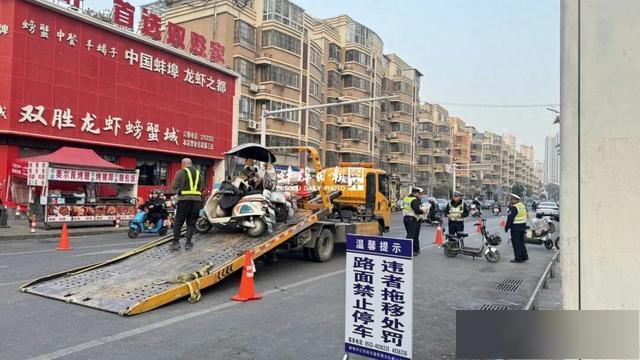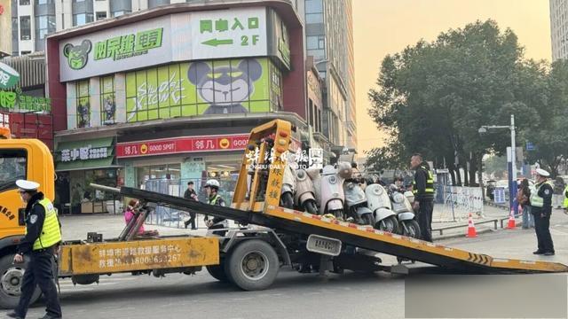 万达商圈业态丰富、人流车流高度密集,叠加大量共享电单车及市民非机动车停车需求,这一路段交通压力极大,导致航苑路与汇达路,航苑路与通达路道路两侧的机动车道上,也停满了非机动车,阻碍道路通行。针对这一情况,市交管部门派驻警力,组织拖车,每天不定时对该路段两侧违法停放的非机动车进行拖移。违法停放的非机动车被拖移后,非机动车车主可以持有效证件,前往蚌山区交通管理大队接受处罚后,归还车辆。