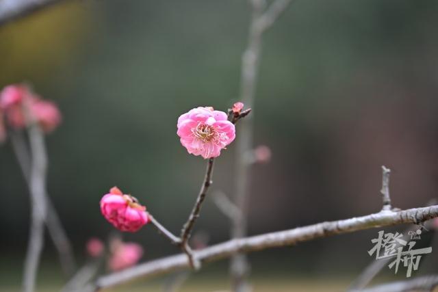 除了蜡梅,还有一些开得比较早的梅花品种,也会在这段时间初开,它有个好听的名字叫粉红朱砂,属于朱砂品种群,就是通常所说的“红梅”。枝条的木质部为暗红色,有“铁骨丹心”之称。