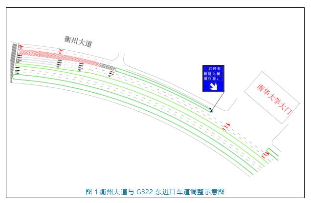 衡州大道与G322路口位于衡阳市蒸湘区,为主要进出城路口,日常车流量较大、车速较快。南华大学雨母校区位于该路口东进口300米左右,掉头需求较大,需短距离横跨三个车道,安全隐患较大的同时还会干扰主线车流。为减少校区掉头车辆对主线车流的干扰,将重新规划车道功能,具体措施如下: