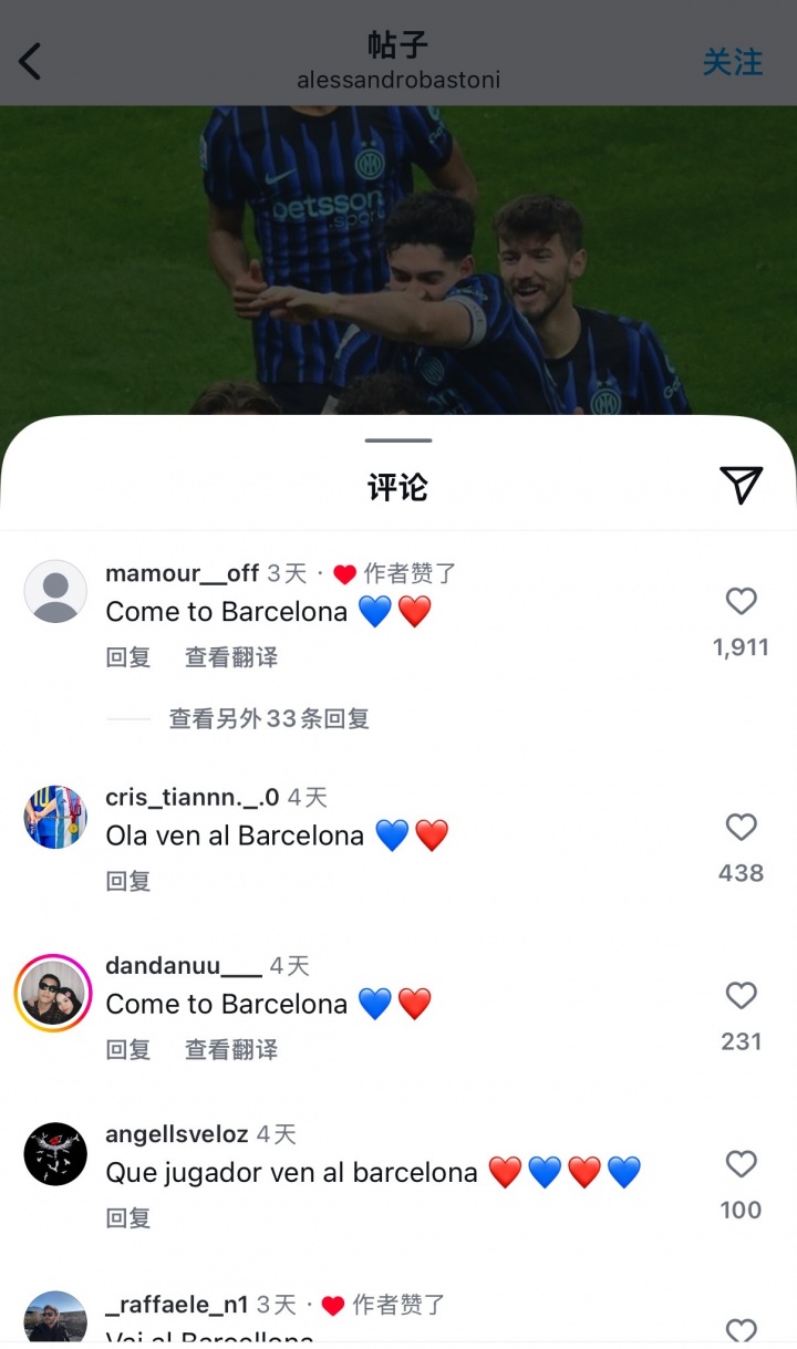 直播吧12月22日讯近期,有不少关于巴萨有意国米中卫巴斯托尼的传闻,有巴萨球迷在巴斯托尼社媒下喊话球员来巴萨,巴斯托尼本人点赞了两条这样的评论。